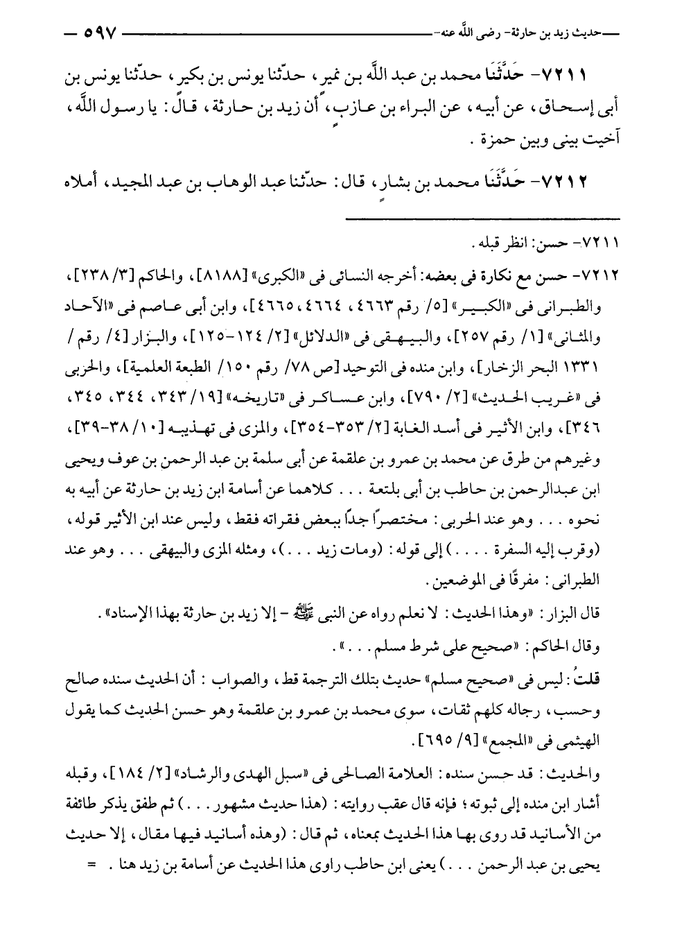 ٧٢١٢ - حسن مع نكارة في بعضه: أخرجه النسائي في "الكبرى" [٨١٨٨]، والحاكم [٣/ ٢٣٨]، والطبراني في "الكبير" [٥/ رقم ٤٦٦٣، ٤٦٦٤، ٤٦٦٥]، وابن أبي عاصم في "الآحاد والمثاني" [١/ رقم ٢٥٧]، والبيهقي في "الدلائل" [٢/ ١٢٤ - ١٢٥]، والبزار [٤/ رقم/ ١٣٣١ البحر الزخار]، وابن منده في التوحيد [ص ٧٨/ رقم ١٥٥/ الطبعة العلمية]، والحزبي في "غريب الحديث" [٢/ ٧٩٠]، وابن عساكر في "تاريخه" [١٩/ ٣٤٣، ٣٤٤، ٣٤٥، ٣٤٦]، وابن الأثير في أسد الغابة [٢/ ٣٥٣ - ٣٥٤]، والمزى في تهذيبه [١٠/ ٣٨ - ٣٩]، وغيرهم من طرق عن محمد بن عمرو بن علقمة عن أبي سلمة بن عبد الرحمن بن عوف ويحيى بن عبد الرحمن بن حاطب بن أبي بلتعة ... كلاهما عن أسامة بن زيد بن حارثة عن أبيه به نحوه ... وهو عند الحربي: مختصرًا جدًّا ببعض فقراته فقط، وليس عند ابن الأثير قوله، (وقرب إليه السفرة .... ) إلى قوله: (ومات زيد ... )، ومثله المزي والبيهقي ... وهو عند الطبراني: مفرقًا في الموضعين.