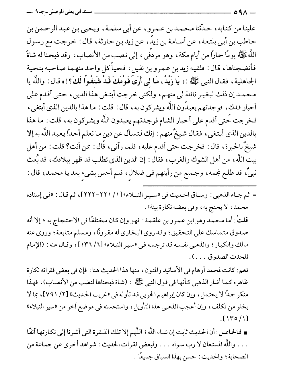 علينا من كتابه، حدّثنا محمد بن عمرٍو، عن أبي سلمة، ويحيى بن عبد الرحمن بن حاطب بن أبي بلتعة، عن أسامة بن زيد، عن زيدٍ بن حارثة، قال: خرجت مع رسول الله - صلى الله عليه وسلم - يومًا حارًا من أيام مكة، وهو مردفي، إلى نصبٍ من الأنصاب، وقد ذبحنا له شاةً فأنضجناها، قال: فلقيه زيد بن عمرو بن نفيلٍ، فحيا كل واحدٍ منهما صاحبه بتحية الجاهلية، فقال النبي - صلى الله عليه وسلم -: "يَا زَيْد، مَا لِي أَرَى قَوْمَكَ قَدْ شَنِفُوا لَكَ؟! " قال: واللَّه يا محمد إن ذلك لبغير نائلةٍ لى منهم، ولكني خرجت أبتغي هذا الدين، حتى أقدم على أحبار فدكٍ، فوجدتهم يعبدون الله ويشركون به، قال: قلتُ: ما هذا بالدين الذي أبتغي، فخرجت حتى أقدم على أحبار الشام فوجدتهم يعبدون الله ويشركون به، قلتُ: ما هذا بالدين الذي أبتغي، فقال شيخٌ منهم: إنك لتسأل عن دين ما نعلم أحدًا يعبد الله به إلا شيخٌ بالحيرة، قال: فخرجت حتى أقدم عليه، فلما رآنى، قال: ممن أنت؟ قلتُ: من أهل بيت الله، من أهل الشوك والغرب، فقال: إن الدين الذي تطلب قد ظهر ببلادك، قد بُعث نبىٌ، قد طلع نجمه، وجميع من رأيتهم في ضلالٍ، فلم أحس بشئٍ بعد يا محمد، قال: