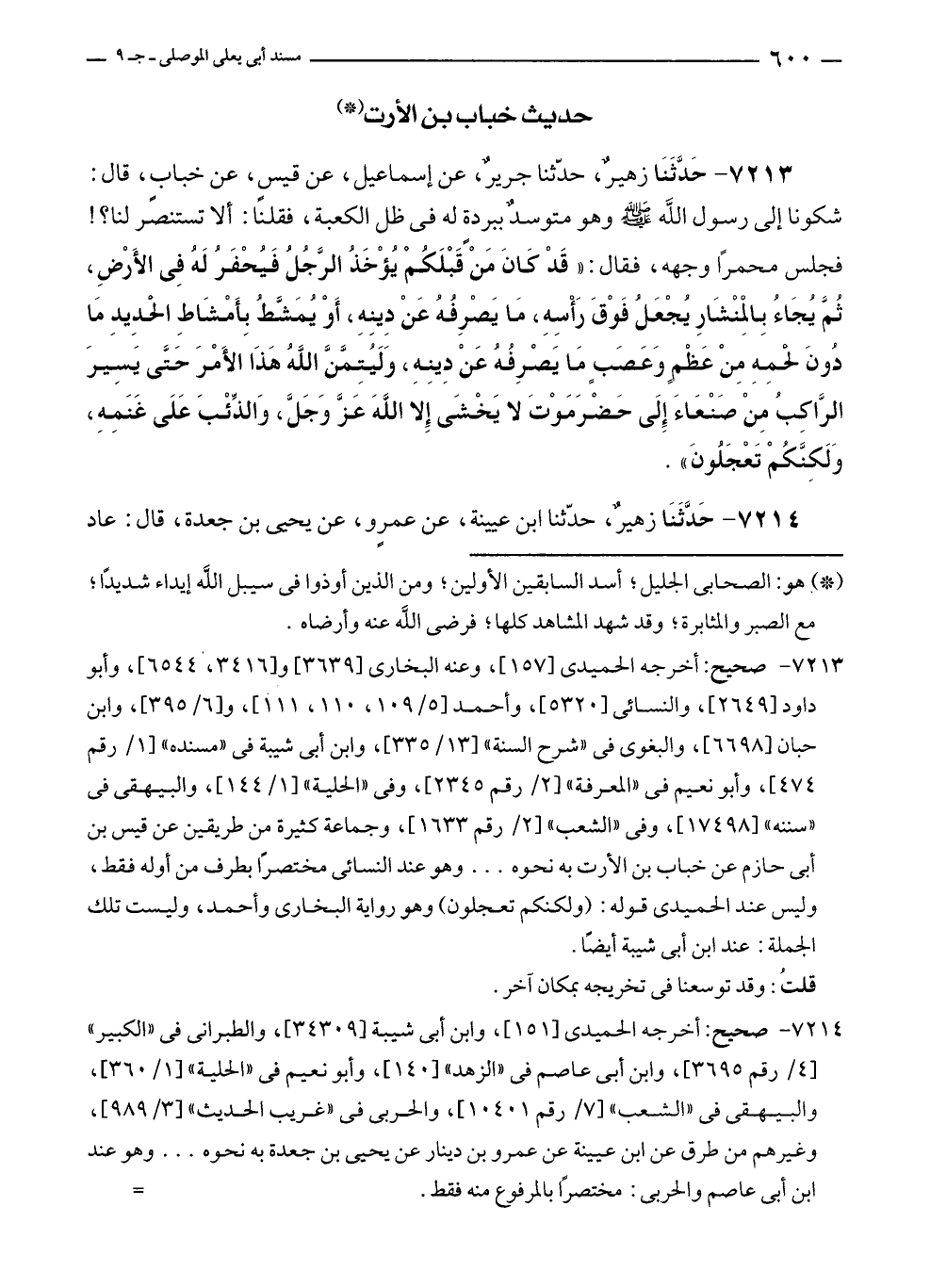 ٧٢١٣ - صحيح: أخرجه الحميدي [١٥٧]، وعنه البخاري [٣٦٣٩] و [٣٤١٦، ٦٥٤٤]، وأبو داود [٢٦٤٩]، والنسائي [٥٣٢٠]، وأحمد [٥/ ١٠٩، ١١٠، ١١١]، و [٦/ ٣٩٥]، وابن حبان [٦٦٩٨]، والبغوي في "شرح السنة" [١٣/ ٣٣٥]، وابن أبي شيبة في "مسنده" [١/ رقم ٤٧٤]، وأبو نعيم في "المعرفة" [٢/ رقم ٢٣٤٥]، وفي "الحلية" [١/ ١٤٤]، والبيهقي في "سننه" [١٧٤٩٨]، وفي "الشعب" [٢/ رقم ١٦٣٣]، وجماعة كثيرة من طريقين عن قيس بن أبي حازم عن خباب بن الأرت به نحوه ... وهو عند النسائي مختصرًا بطرف من أوله فقط، وليس عند الحميدي قوله: (ولكنكم تعجلون) وهو رواية البخاري وأحمد، وليست تلك الجملة: عند ابن أبي شيبة أيضًا.
