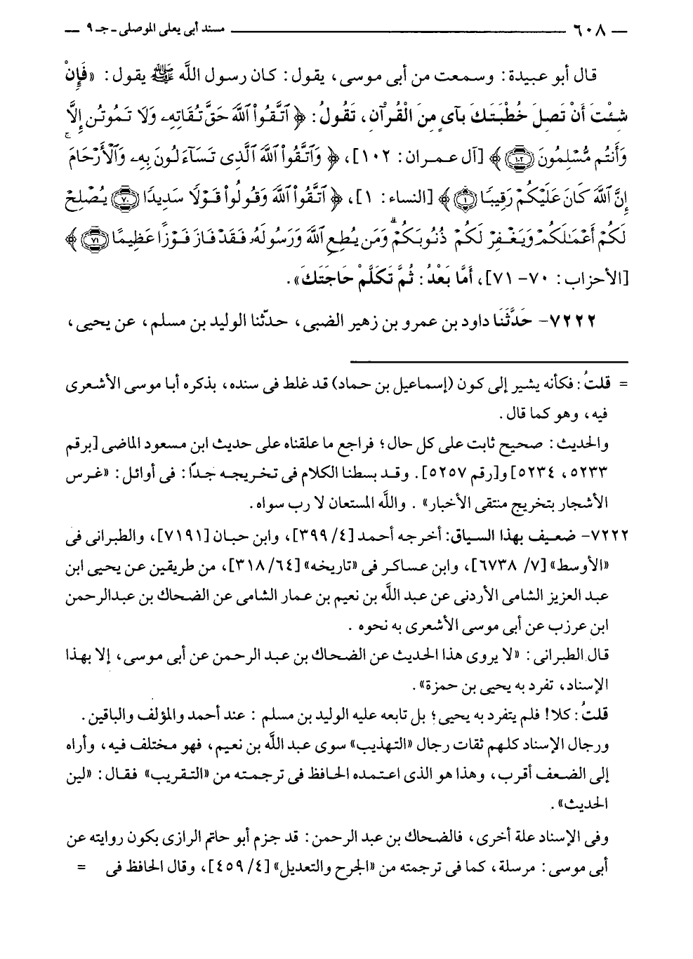 ٧٢٢٢ - حَدَّثَنَا داود بن عمرو بن زهير الضبي، حدّثنا الوليد بن مسلم، عن يحيى،