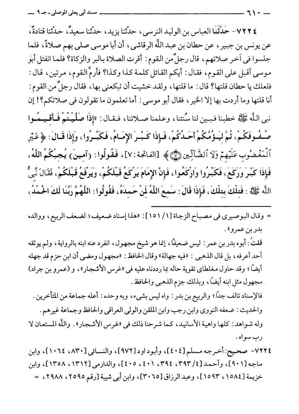 ٧٢٢٤ - حَدَّثَنَا العباس بن الوليد النرسى، حدّثنا يزيد، حدّثنا سعيدٌ، حدّثنا قتادةٌ، عن يونس بن جبير، عن حطان بن عبد الله الرقاشي، أن أبا موسى صلى بهم صلاةً، فلما جلسوا في آخر صلاتهم، قال رجلٌ من القوم: أقرت الصلاة بالبر والزكاة؟ فلما انفتل أبو موسى أقبل على القوم، فقال: أيكم القائل كلمة كذا وكذا؟ فأرمَّ القوم، مرتين، قال: فلعلك يا حطان قلتها؟ قال: ما قلتها، ولقد خشيت أن تبكعنى بها، فقال رجلٌ من القوم: أنا قلتها وما أردت بها إلا الخير، فقال أبو موسى: أما تعلمون ما تقولون في صلاتكم؟! إن نبي الله - صلى الله عليه وسلم - خطبنا فبين لنا سُنتنا، وعلمنا صلاتنا، فقال: "إِذَا صَلَّيْتُمْ فَأَقِيمُوا صُفُوفَكُمْ، ثُمَ لِيَؤُمَّكُمْ أَحَدُكُمْ، فَإِذَا كَبَّرَ الإِمَام، فَكَبِّرُوا، وَإِذَا قَالَ: {غَيْرِ الْمَغْضُوبِ عَلَيْهِمْ وَلَا الضَّالِّينَ (٧)} [الفاتحة: ٧]، فَقُولُوا: (آمِينَ) يُجِبْكُمُ اللَّه، فَإِذَا كَبَّرَ وَرَكَعَ، فَكَبِّرُوا وَارْكَعُوا، فَإِنَّ الإِمَامَ يَرْكَعُ قَبْلَكمْ، وَيَرْفَعُ قَبْلَكُمْ، فَقَالَ نبِيُّ الله - صلى الله عليه وسلم -: فَتِلْكَ بِتِلْكَ، فَإِذَا قَالَ: سَمِعَ اللَّهُ لمَنْ حَمِدَه، فَقُولُوا: اللَّهُمَّ رَبَّنَا لَكَ الحَمْد،