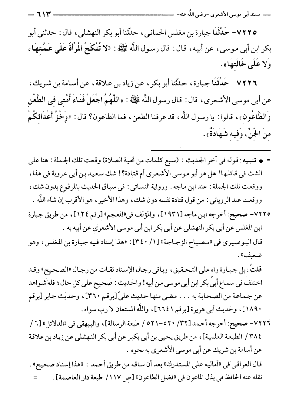 ٧٢٢٥ - حَدَّثَنَا جبارة بن مغلس الحماني، حدّثنا أبو بكر النهشلى، قال: حدثني أبو بكر بن أبي موسى، عن أبيه، قال: قال رسول الله - صلى الله عليه وسلم -: "لا تُنْكَحُ المرْأَةُ عَلَى عَمَّتِهَا، وَلا عَلَى خَالَتِهَا".