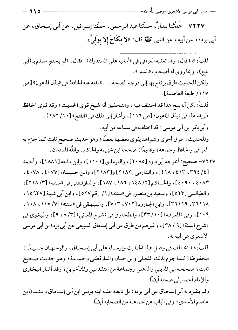 ٧٢٢٧ - حَدَّثَنَا بندارٌ، حدّثنا عبد الرحمن، حدّثنا إسرائيل، عن أبي إسحاق، عن بردة، عن أبيه، عن النبي - صلى الله عليه وسلم - قال: "لا نِكَاحَ إِلا بِوَلِيٍّ".