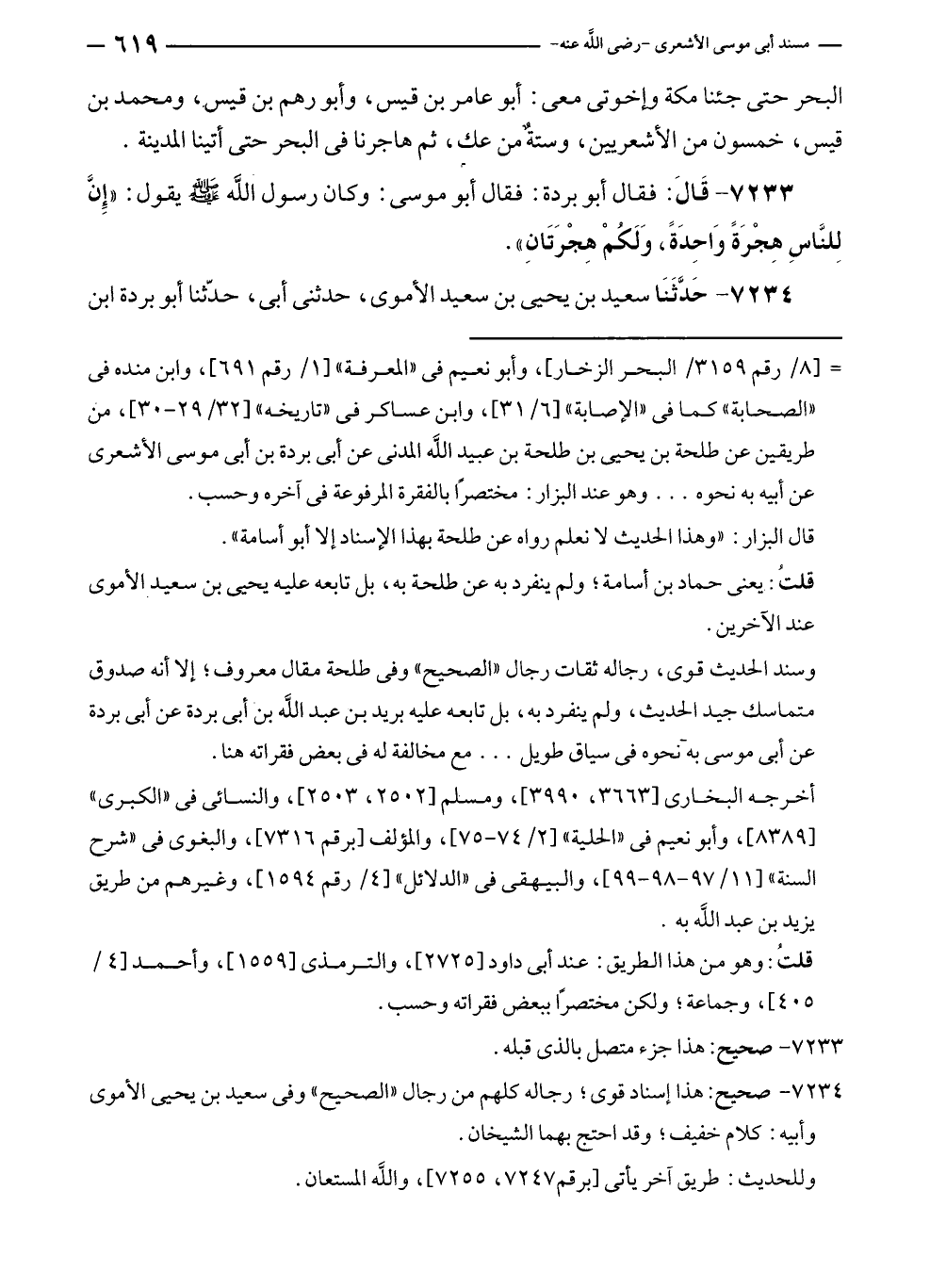 ٧٢٣٣ - قَالَ: فقال أبو بردة: فقال أبو موسى: وكان رسول الله - صلى الله عليه وسلم - يقول: "إِنَّ لِلنَّاسِ هِجْرَةً وَاحِدَةً، وَلَكُمْ هِجْرَتَانِ".
