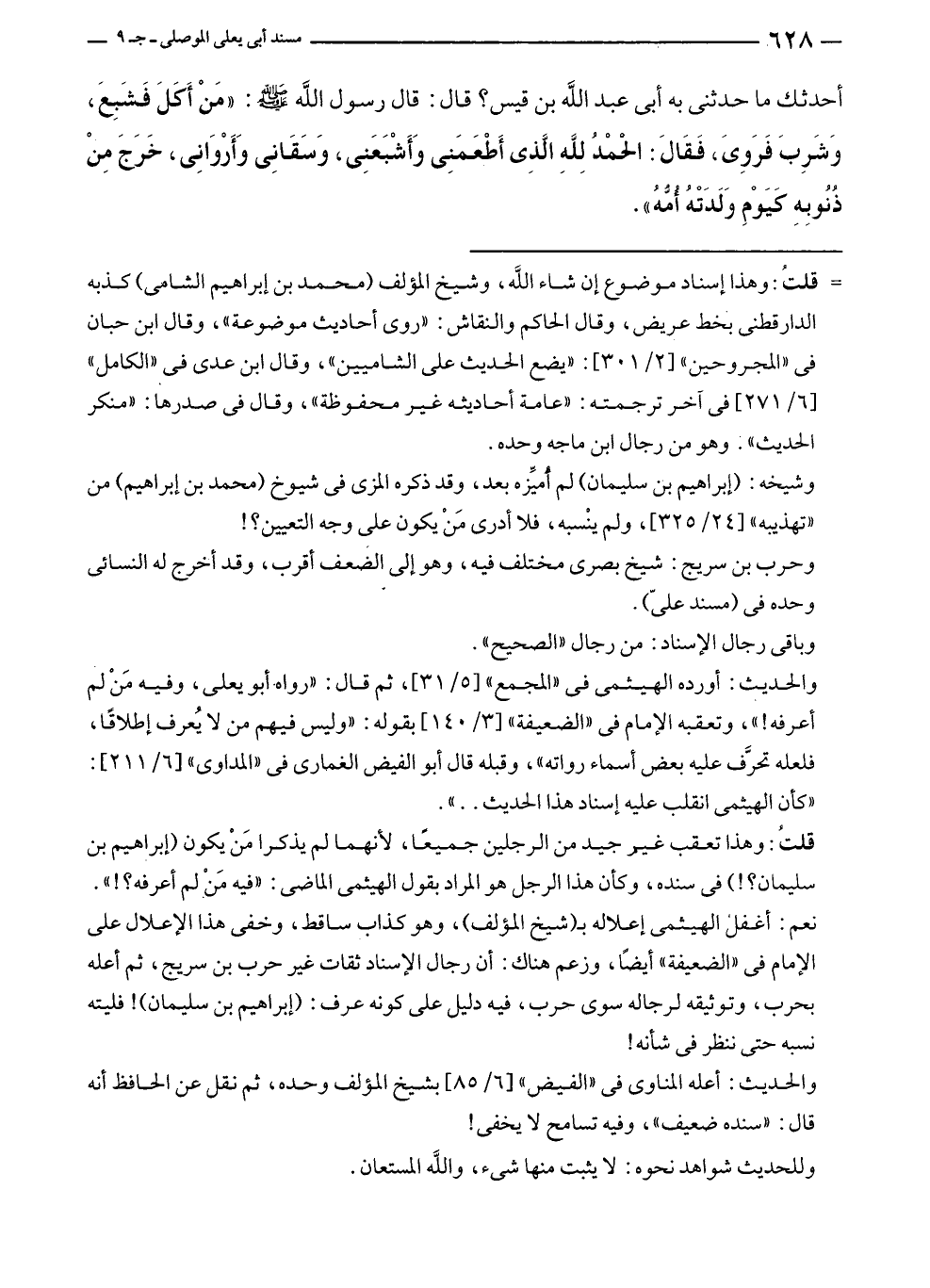 قلتُ: وهذا تعقب غير جيد من الرجلين جميعًا، لأنهما لم يذكرا مَنْ يكون (إبراهيم بن سليمان؟!) في سنده، وكأن هذا الرجل هو المراد بقول الهيثمي الماضي: "فيه مَنْ لم أعرفه؟! ". نعم: أغفل الهيثمي إعلاله بـ (شيخ المؤلف)، وهو كذاب ساقط، وخفى هذا الإعلال على الإمام في "الضعيفة" أيضًا، وزعم هناك: أن رجال الإسناد ثقات غير حرب بن سريج، ثم أعله بحرب، وتوثيقه لرجاله سوى حرب، فيه دليل على كونه عرف: (إبراهيم بن سليمان)! فليته نسبه حتى ننظر في شأنه!