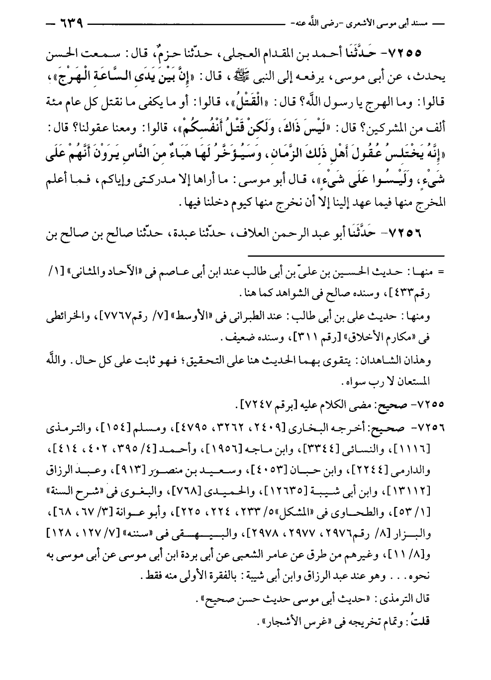 ٧٢٥٥ - حَدَّثَنَا أحمد بن المقدام العجلي، حدّثنا حزمٌ، قال: سمعت الحسن يحدث، عن أبي موسى، يرفعه إلى النبي - صلى الله عليه وسلم -، قال: "إِنَّ بَيْن يَدَى السَّاعَةِ الْهَرْجَ"، قالوا: وما الهرج يا رسول الله؟ قال: "الْقَتْلُ"، قالوا: أو ما يكفى ما نقتل كل عام مئة ألف من المشركين؟ قال: "لَيْسَ ذَاكَ، وَلَكِنْ قَتْلُ أَنْفُسِكُمْ"، قالوا: ومعنا عقولنا؟ قال: "إِنَّهُ يَخْتَلِسُ عُقُولَ أَهْلِ ذَلِكَ الزَّمَانِ، وَسَيُؤَخَّرُ لَهَا هَبَاءٌ مِنَ النَّاسِ يَرَوْنَ أَنَّهُمْ عَلَى شَىْءٍ، وَلَيْسُوا عَلَى شَىْءٍ"، قال أبو موسى: ما أراها إلا مدركتى وإياكم، فما أعلم المخرج منها فيما عهد إلينا إلا أن نخرج منها كيوم دخلنا فيها.