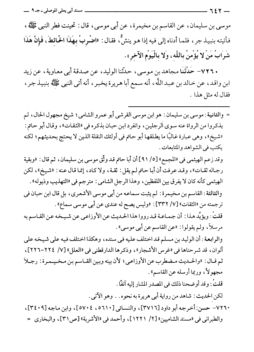 ٧٢٦٠ - حَدَّثَنَا مجاهد بن موسى، حدّثنا الوليد، عن صدقة أبى معاوية، عن زيد بن واقد، عن خالد بن عبد الله، أنه سمع أبا هريرة يخبر، أنه أتى النبي - صلى الله عليه وسلم - بنبيذ جر، فقال له مثل هذا.
