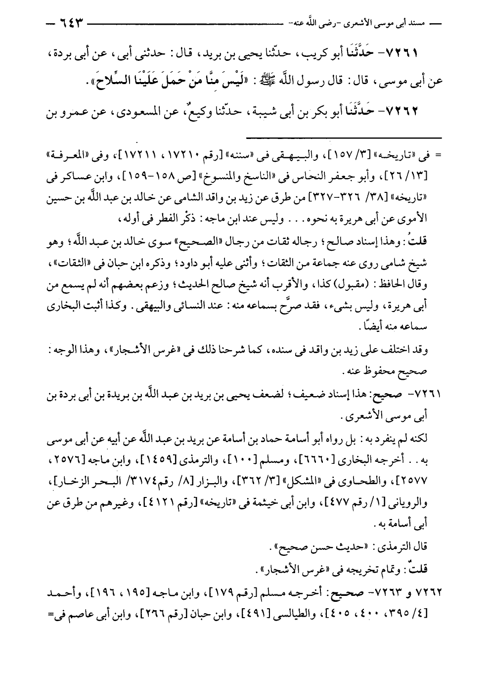 ٧٢٦١ - حَدَّثَنَا أبو كريب، حدّثنا يحيى بن بريد، قال: حدثنى أبى، عن أبى بردة، عن أبى موسى، قال: قال رسول الله - صلى الله عليه وسلم -: "لَيْسَ مِنَّا مَنْ حَمَلَ عَلَيْنَا السِّلاحَ".