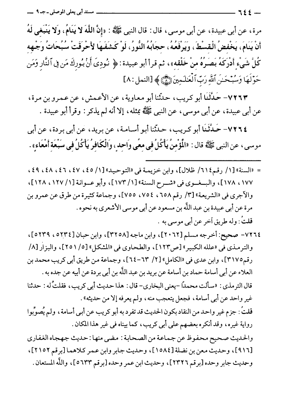 ٧٢٦٤ - حَدَّثَنَا أبو كريب، حدّثنا أبو أسامة، عن بريد، عن أبى بردة، عن أبى موسى، عن النبي - صلى الله عليه وسلم - قال: "الْمُؤْمِنُ يَأْكُلُ فِي مِعًى وَاحِدٍ، وَالْكَافِرُ يَأْكلُ فِي سَبْعَةِ أَمْعَاءٍ".