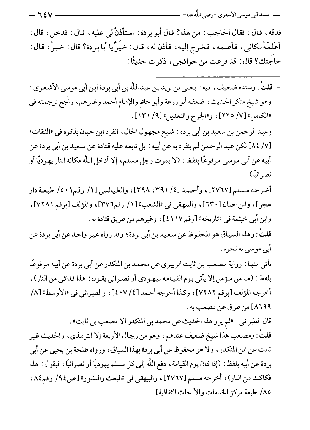 يأتى منها: رواية مصعب بن ثابت الزبيرى عن محمد بن المنكدر عن أبى بردة عن أبيه مرفوعًا بلفظ: (ما من مؤمن إلا يأتى يوم القيامة بيهودى أو نصرانى يقول: هذا فدائى من النار)، أخرجه المؤلف [برقم ٧٢٨٢]، وكذا أخرجه أحمد [٤/ ٤٠٧]، والطبرانى في "الأوسط" [٨/ ٨٦٩٩] من طرق عن مصعب به.
