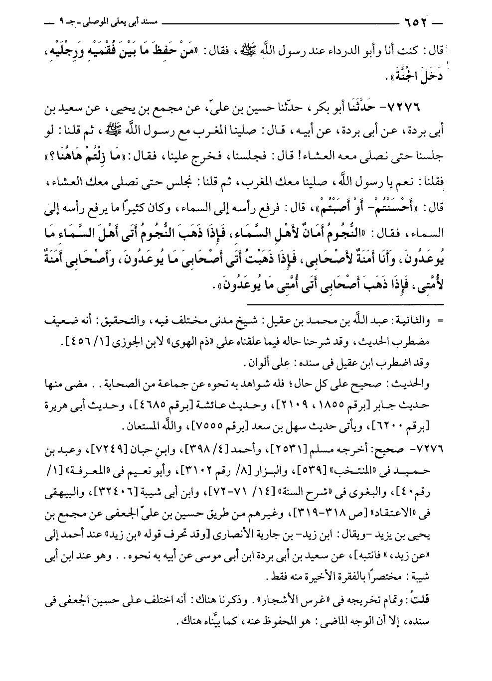 ٧٢٧٦ - حَدَّثَنَا أبو بكر، حدّثنا حسين بن عليّ، عن مجمع بن يحيى، عن سعيد بن أبى بردة، عن أبى بردة، عن أبيه، قال: صلينا المغرب مع رسول الله - صلى الله عليه وسلم -، ثم قلنا: لو جلسنا حتى نصلى معه العشاء! قال: فجلسنا، فخرج علينا، فقال: "مَا زِلْتُمْ هَاهنَا؟ " فقلنا: نعم يا رسول الله، صلينا معك المغرب، ثم قلنا: نجلس حتى نصلى معك العشاء، قال: "أَحْسَنْتُمْ - أَوْ أَصَبْتُمْ"، قال: فرفع رأسه إلى السماء، وكان كثيرًا ما يرفع رأسه إلى السماء، فقال: "النُّجومُ أَمَانٌ لأَهْلِ السَّمَاءِ، فَإِذَا ذَهَبَتُ النُّجُومُ أَتَى أَهْلَ السَّمَاءِ مَا يُوعَدُونَ، وَأَنَا أَمَنَةٌ لأَصْحَابِى، فَإذَا ذَهَبْتُ أَتَى أَصْحَابِىَ مَا يُوعَدُونَ، وَأَصْحَابِى أَمَنَةٌ لأُمَّتِى، فَإِذَا ذَهَبَ أَصْحَابِى أَتَى أُمَّتِى مَا يُوعَدُونَ".