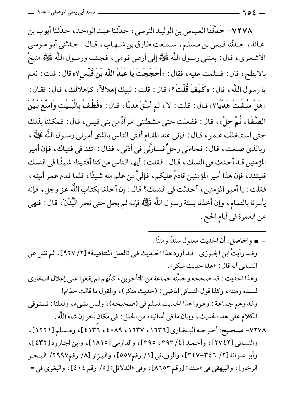 ٧٢٧٨ - حَدَّثَنَا العباس بن الوليد النرسى، حدّثنا عبد الواحد، حدّثنا أيوب بن عائذ، حدثّنا قيس بن مسلم، سمعت طارق بن شهاب، قال: حدثنى أبو موسى الأشعرى، قال: بعثنى رسول الله - صلى الله عليه وسلم - إلى أرض قومى، فجئت ورسول الله - صلى الله عليه وسلم - منيخٌ بالأبطح، قال: فسلمت عليه، فقال: "أَحَجَجْتَ يَا عَبْدَ اللَّهِ بْنَ قَيْسٍ؟ " قال: قلت: نعم يا رسول الله، قال: "كَيْفَ قُلْتَ؟ " قال: قلت: لبيك إهلالًا، كإهلالك، قال: فقال: "هَلْ سُقْتَ هَدْيًا؟ " قال: قلت: لا، لم أسُقْ هديًا، قال: "فَطُفْ بِالْبَيْتِ وَاسْعَ بَيْنَ الصَّفَا، ثُمَّ حِلَّ"، قال: ففعلت حتى مشطتنى امرأةٌ من بنى قيس، قال: فمكثنا بذلك حتى استخلف عمر، قال: فإنى عند المقام أفتى الناس بالذى أمرنى رسول الله - صلى الله عليه وسلم -، وبالذى صنعت، قال: فجاءنى رجلٌ فسارَّنى في أذنى، فقال: اتئد في فتياك، فإن أمير المؤمنين قد أحدث في النسك، قال: فقلت: أيها الناس من كنا أفتيناه شيئًا في النسك فليتئد، فإن هذا أمير المؤمنين قادمٌ عليكم، فإليَّ من علم منه شيئًا، فلما قدم عمر أتيته، فقلت: يا أمير المؤمنين، أحدثت في النسك؟ قال: إن أخذنا بكتاب الله عز وجل، فإنه يأمرنا بالتمام، وإن أخذنا بسنة رسول الله - صلى الله عليه وسلم - فإنه لم يحل حتى نحر الْبُدْنَ، قال: فنهى عن العمرة في أيام الحج.