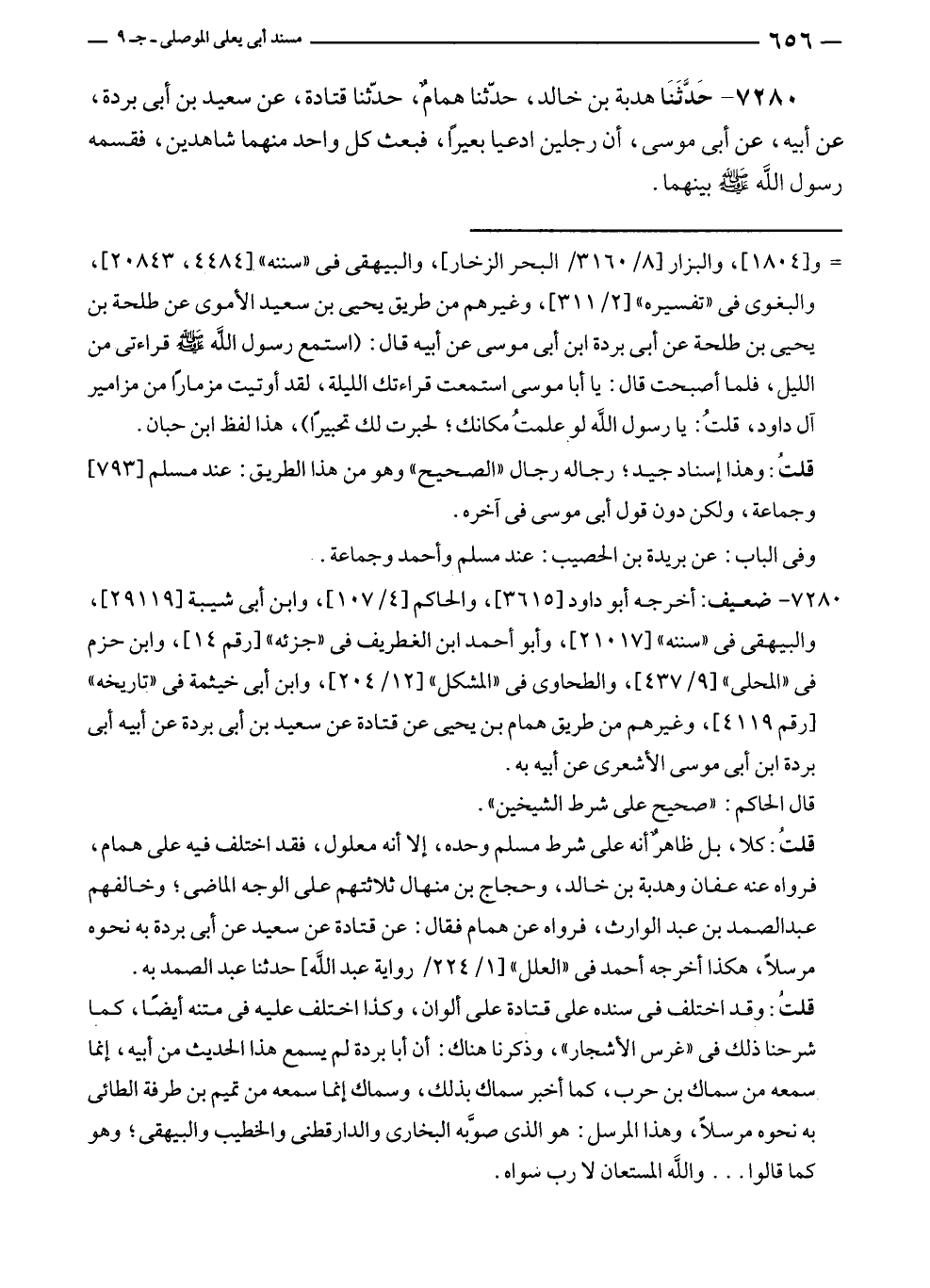 ٧٢٨٠ - حَدَّثَنَا هدبة بن خالد، حدّثنا همامٌ، حدّثنا قتادة، عن سعيد بن أبى بردة، عن أبيه، عن أبى موسى، أن رجلين ادعيا بعيرًا، فبعث كل واحد منهما شاهدين، فقسمه رسول الله - صلى الله عليه وسلم - بينهما.