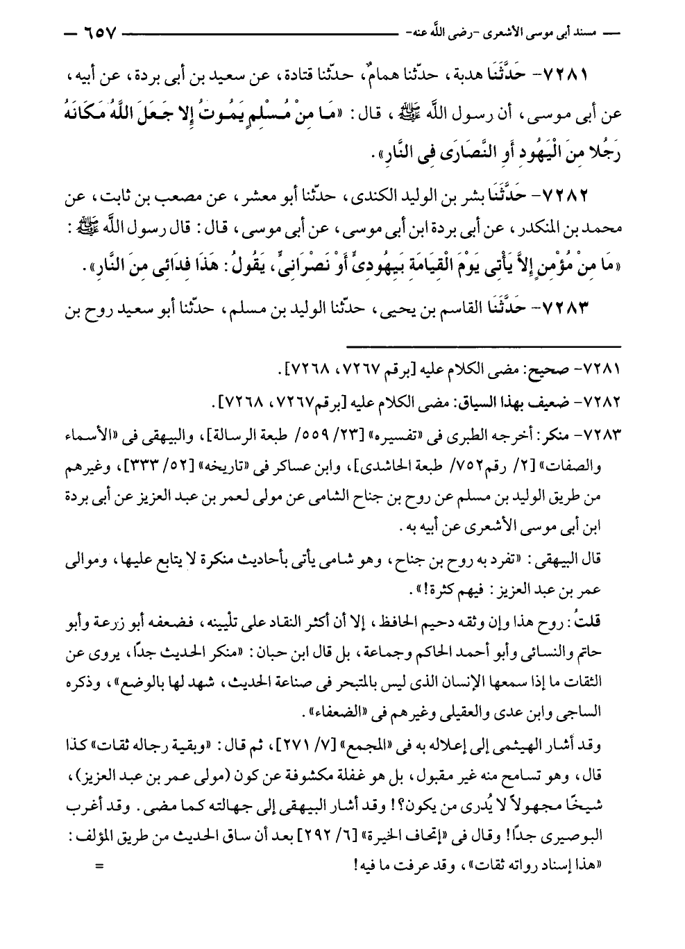 ٧٢٨١ - حَدَّثَنَا هدبة، حدّثنا همام، حدّثنا قتادة، عن سعيد بن أبى بردة، عن أبيه، عن أبى موسى، أن رسول الله - صلى الله عليه وسلم -، قال: "مَا مِنْ مُسْلِمٍ يَمُوتُ إِلا جَعَلَ اللَّهُ مَكَانَهُ رَجُلا مِنَ الْيَهُودِ أَوِ النَّصَارَى فِي النَّارِ".