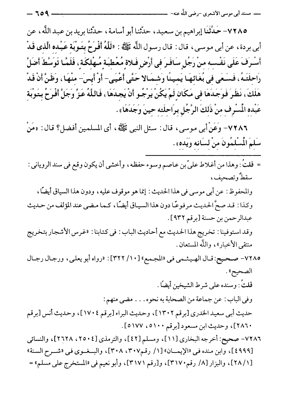 ٧٢٨٥ - حَدَّثَنَا إبراهيم بن سعيد، حدّثنا أبو أسامة، حدّثنا بريد بن عبد الله، عن أبى بردة، عن أبى موسى، قال: قال رسول الله - صلى الله عليه وسلم -: "الَلَّهُ أَفْرَحُ بِتَوْبةِ عَبْدِهِ الَّذِي قَدْ أَسْرَفَ عَلَى نَفْسِهِ مِنْ رَجُلٍ سَافَرَ فِي أَرْضٍ فَلاةٍ مُعْطِبَةٍ مُهْلِكَةٍ، فَلَمَّا تَوَسَّطَ أَضَلَّ رَاحِلَتَه، فَسَعَى فِي بُغَائِهَا يَمِينًا وَشِمَالا حَتَّى أَعْيَى - أَوْ أَيِسَ - مِنْهَا، وَظَنَّ أَنْ قَدْ هَلَكَ، نَظَرَ فَوَجَدَهَا فِي مَكَانٍ لَمْ يَكُنْ يَرْجُو أَنْ يَجِدَهَا، فَاللَّهُ عَزَّ وَجَل أَفْرَحُ بِتَوْبَةِ عَبْدِهِ الْمُسْرِفِ مِنْ ذَلِكَ الرَّجُلِ بِرَاحِلَتِهِ حِينَ وَجَدَهَا".