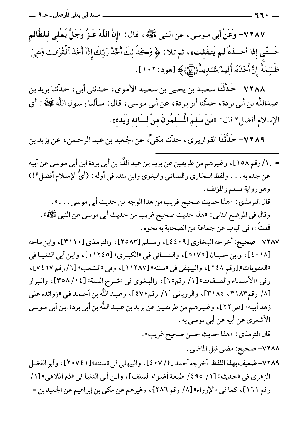 ٧٢٨٨ - حَدَّثَنَا سعيد بن يحيى بن سعيد الأموى، حدثنى أبى، حدّثنا بريد بن عبد الله بن أبى بردة، حدّثنا أبو بردة، عن أبى موسى، قال: سألنا رسول الله - صلى الله عليه وسلم -: أي الإسلام أفضل؟ قال: "مَنْ سَلِمَ الْمُسْلِمونَ مِنْ لِسَانِهِ وَيَدِهِ".