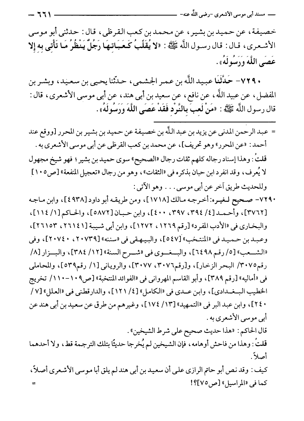 قلتُ: وهذا إسناد رجاله كلهم ثقات رجال "الصحيح" سوى حميد بن بشير، فهو شيخ مجهول لا يُعرف، وقد انفرد ابن حبان بذكره في "الثقات"، وهو من رجال "تعجيل المنفعة" [ص ١٠٥] وللحديث طريق آخر عن أبى موسى ... وهو الآتى: