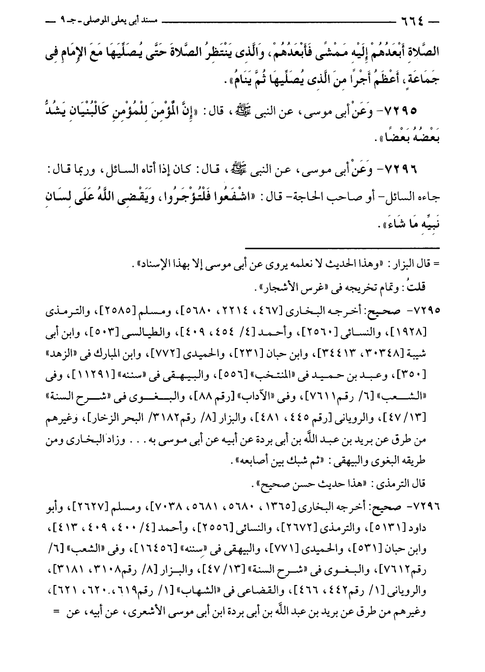 ٧٢٩٥ - صحيح: أخرجه البخارى [٤٦٧، ٢٢١٤، ٥٦٨٠]، ومسلم [٢٥٨٥]، والترمذى [١٩٢٨]، والنسائى [٢٥٦٠]، وأحمد [٤/ ٤٥٤، ٤٠٩]، والطيالسى [٥٠٣]، وابن أبى شيبة [٣٠٣٤٨، ٣٤٤١٣]، وابن حبان [٢٣١]، والحميدى [٧٧٢]، وابن المبارك في "الزهد" [٣٥٠]، وعبد بن حميد في "المنتخب" [٥٥٦]، والبيهقى في "سننه" [١١٢٩١]، وفى "الشعب" [٦/ رقم ٧٦١١]، وفى "الآداب" [رقم ٨٨]، والبغوى في "شرح السنة" [١٣/ ٤٧]، والروياني [رقم ٤٤٥، ٤٨١]، والبزار [٨/ رقم ٣١٨٢/ البحر الزخار]، وغيرهم من طرق عن بريد بن عبد الله بن أبى بردة عن أبيه عن أبى موسى به .. ، وزاد البخارى ومن طريقه البغوى والبيهقى: "ثم شبك بين أصابعه".
