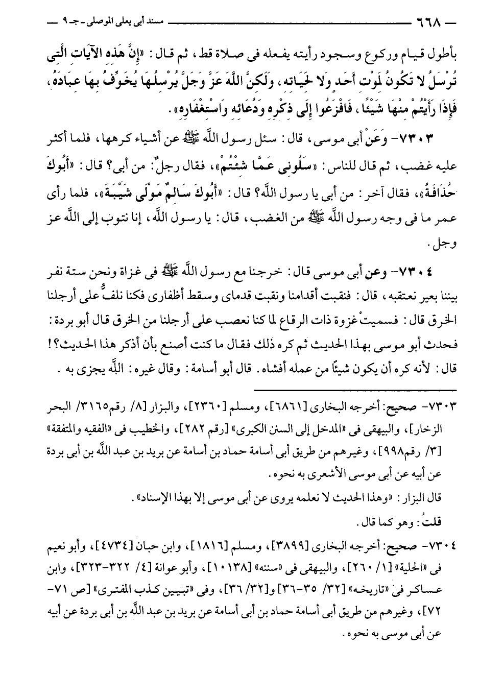 ٧٣٠٤ - صحيح: أخرجه البخارى [٣٨٩٩]، ومسلم [١٨١٦]، وابن حبان [٤٧٣٤]، وأبو نعيم في "الحلية" [١/ ٢٦٠]، والبيهقى في "سننه" [١٠١٣٨]، وأبو عوانة [٤/ ٣٢٢ - ٣٢٣]، وابن عساكر في "تاريخه" [٣٢/ ٣٥ - ٣٦] و [٣٢/ ٣٦]، وفى "تبيين كذب المفترى" [ص ٧١ - ٧٢]، وغيرهم من طريق أبى أسامة حماد بن أبى أسامة عن بريد بن عبد الله بن أبى بردة عن أبيه عن أبى موسى به نحوه.
