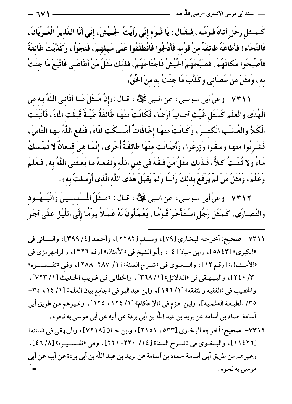 ٧٣١١ - وَعَنْ أبى موسى، عن النبي - صلى الله عليه وسلم -، قال: "إِنَّ مَثَلَ مَا أَتَانِى اللَّهُ بِهِ مِنَ الْهُدَى وَالْعِلْمِ كَمَثَلِ غَيْثٍ أَصَابَ أَرْضًا، فَكَانَتْ مِنْهَا طَائِفَةٌ طَيِّبَةٌ قَبِلَتِ المَاءَ، فَأَنْبَتَتِ الْكَلأَ وَالْعُشْبَ الْكَثِيرَ، وَكَانَتْ مِنْهَا إِخَّاذَاتٌ أَمْسَكَتِ المَاءَ، فَنَفَعَ اللَّهُ بِهَا النَّاسَ، فَشَرِبُوا مِنْهَا وَسَقَوْا وَزَرَعُوا، وَأَصَابَتْ مِنْهَا طَائِفَةٌ أُخْرَى، إِنَّمَا هِىَ قِيعَانٌ لا تُمْسِكُ مَاءً وَلا تُنْبِتُ كَلأً، فَذَلِكَ مَثَلُ مَنْ فَقُهَ فِي دِينِ اللَّهِ وَنَفَعَهُ مَا بَعَثَنِى اللَّهُ بِهِ، فَعَلِمَ وَعَلَّمَ، وَمَثَلُ مَنْ لَمْ يَرْفَعْ بِذَلِكَ رَأْسًا وَلَمْ يَقْبَلْ هُدَى اللَّهِ الَّذِي أُرْسِلْتُ بِهِ".