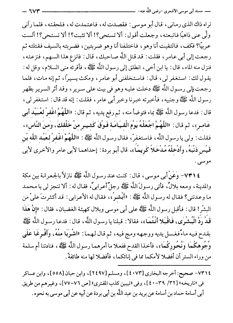 ٧٣١٤ - صحيح: أخرجه البخارى [٤٠٧٣]، ومسلم [٢٤٩٧]، وابن حبان [٥٥٨]، وابن عساكر في "تاريخه" [٣٢/ ٣٩ - ٤٠]، وفى "تبيين كذب المفترى" [ص ٧٦ - ٧٧]، وغيرهم من طريق أبى أسامة حماد بن أسامة عن بريد بن عبد الله بن أبى بردة عن أبيه عن أبى موسى به نحوه.
