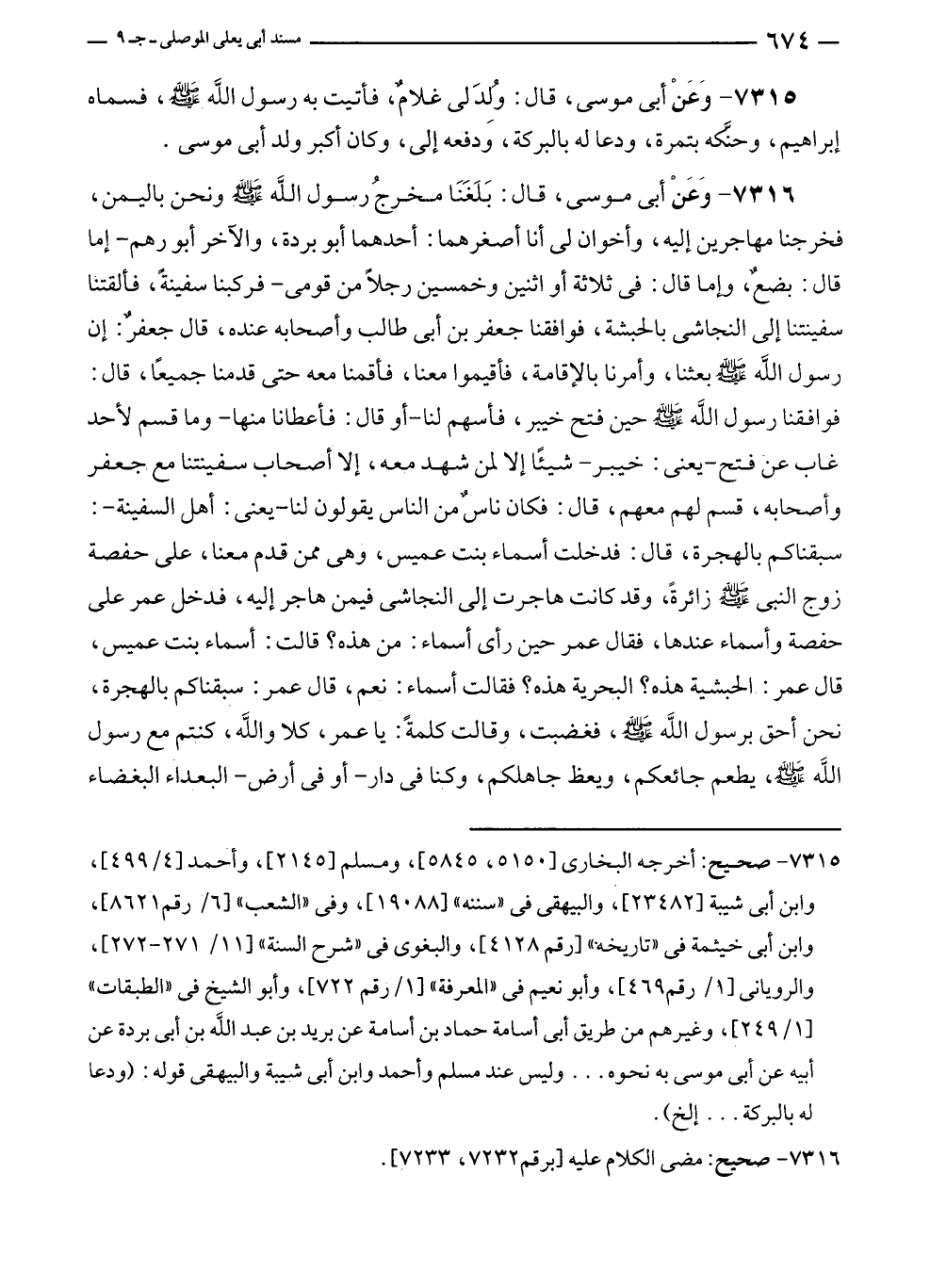 ٧٣١٦ - وَعَنْ أبى موسى، قال: بَلَغَنَا مخرجُ رسول الله - صلى الله عليه وسلم - ونحن باليمن، فخرجنا مهاجرين إليه، وأخوان لى أنا أصغرهما: أحدهما أبو بردة، والآخر أبو رهم - إما قال: بضعٌ، وإما قال: في ثلاثه أو اثنين وخمسين رجلًا من قومى - فركبنا سفينةً، فألقتنا سفينتنا إلى النجاشى بالحبشة، فوافقنا جعفر بن أبى طالب وأصحابه عنده، قال جعفرٌ: إن رسول الله - صلى الله عليه وسلم - بعثنا، وأمرنا بالإقامة، فأقيموا معنا، فأقمنا معه حتى قدمنا جميعًا، قال: فوافقنا رسول الله - صلى الله عليه وسلم - حين فتح خيبر، فأسهم لنا - أو قال: فأعطانا منها - وما قسم لأحد غاب عن فتح - يعنى: خيبر - شيئًا إلا لمن شهد معه، إلا أصحاب سفينتنا مع جعفر وأصحابه، قسم لهم معهم، قال: فكان ناسٌ من الناس يقولون لنا - يعنى: أهل السفينة -: سبقناكم بالهجرة، قال: فدخلت أسماء بنت عميس، وهى ممن قدم معنا، على حفصة زوج النبي - صلى الله عليه وسلم - زائرةً، وقد كانت هاجرت إلى النجاشى فيمن هاجر إليه، فدخل عمر على حفصة وأسماء عندها، فقال عمر حين رأى أسماء: من هذه؟ قالت: أسماء بنت عميس، قال عمر: الحبشية هذه؟ البحرية هذه؟ فقالت أسماء: نعم، قال عمر: سبقناكم بالهجرة، نحن أحق برسول الله - صلى الله عليه وسلم -، فغضبت، وقالت كلمةً: يا عمر، كلا واللَّه، كنتم مع رسول الله - صلى الله عليه وسلم -، يطعم جائعكم، ويعظ جاهلكم، وكنا في دار - أو في أرض - البعداء البغضاء