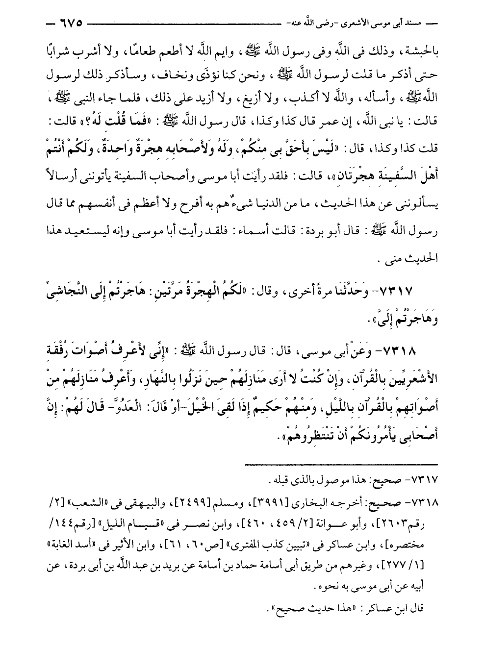 ٧٣١٨ - صحيح: أخرجه البخارى [٣٩٩١]، ومسلم [٢٤٩٩]، والبيهقى في "الشعب" [٢/ رقم ٢٦٠٣]، وأبو عوانة [٢/ ٤٥٩، ٤٦٠]، وابن نصر في "قيام الليل" [رقم ١٤٤/ مختصره]، وابن عساكر في "تبيين كذب المفترى" [ص ٦٠، ٦١]، وابن الأثير في "أسد الغابة" [١/ ٢٧٧]، وغيرهم من طريق أبى أسامة حماد بن أسامة عن بريد بن عبد الله بن أبى بردة، عن أبيه عن أبى موسى به نحوه.