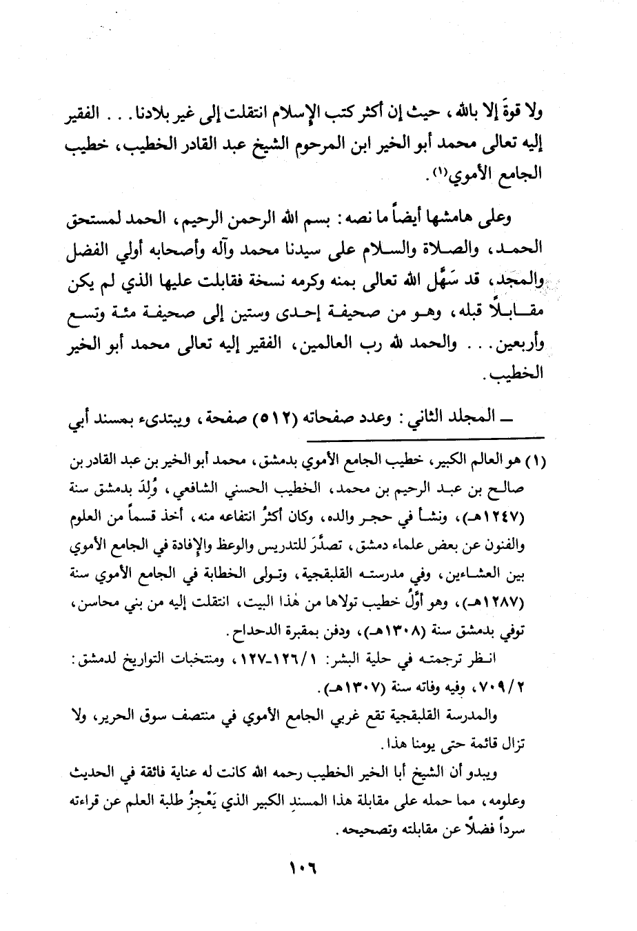 ولا قوةَ إلا بالله، حيث إن أكثر كتب الإسلام انتقلت إلى غير بلادنا ... الفقير إليه تعالى محمد أبو الخير ابن المرحوم الشيخ عبد القادر الخطيب، خطيب الجامع الأموي (١) .