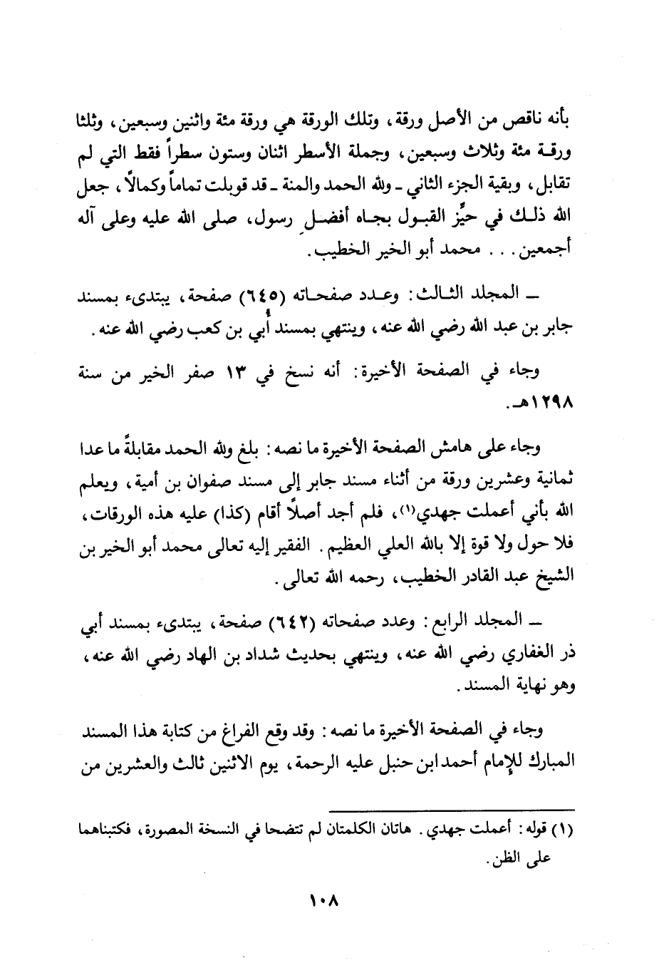 وجاء على هامش الصفحة الأخيرة ما نصه: بلغ ولله الحمد مقابلةً ما عدا ثمانية وعشرين ورقة من أثناء مسند جابر إلى مسند صفوان بن أمية، ويعلم الله بأني أعملت جهدي (١) ، فلم أجد أصلاً أقام (كذا) عليه هذه الورقات، فلا حول ولا قوة إلا بالله العلي العظيم. الفقير إليه تعالى محمد أبو الخير بن الشيخ عبد القادر الخطيب، رحمه الله تعالى.