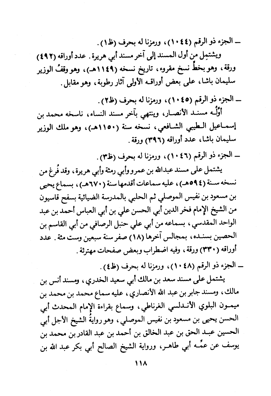 ويشتمِل من أول المسند إلى آخر مسند أبي هريرة. عدد أوراقه (٤٩٢) ورقة، وهو بخطِّ نسخ مقروء، تاريخ نسخه (١١٤٩ هـ) ، وهو وقفُ الوزير سليمان باشا، على بعض أوراقه الأولى آثار رطوبة، وهو مقابل.