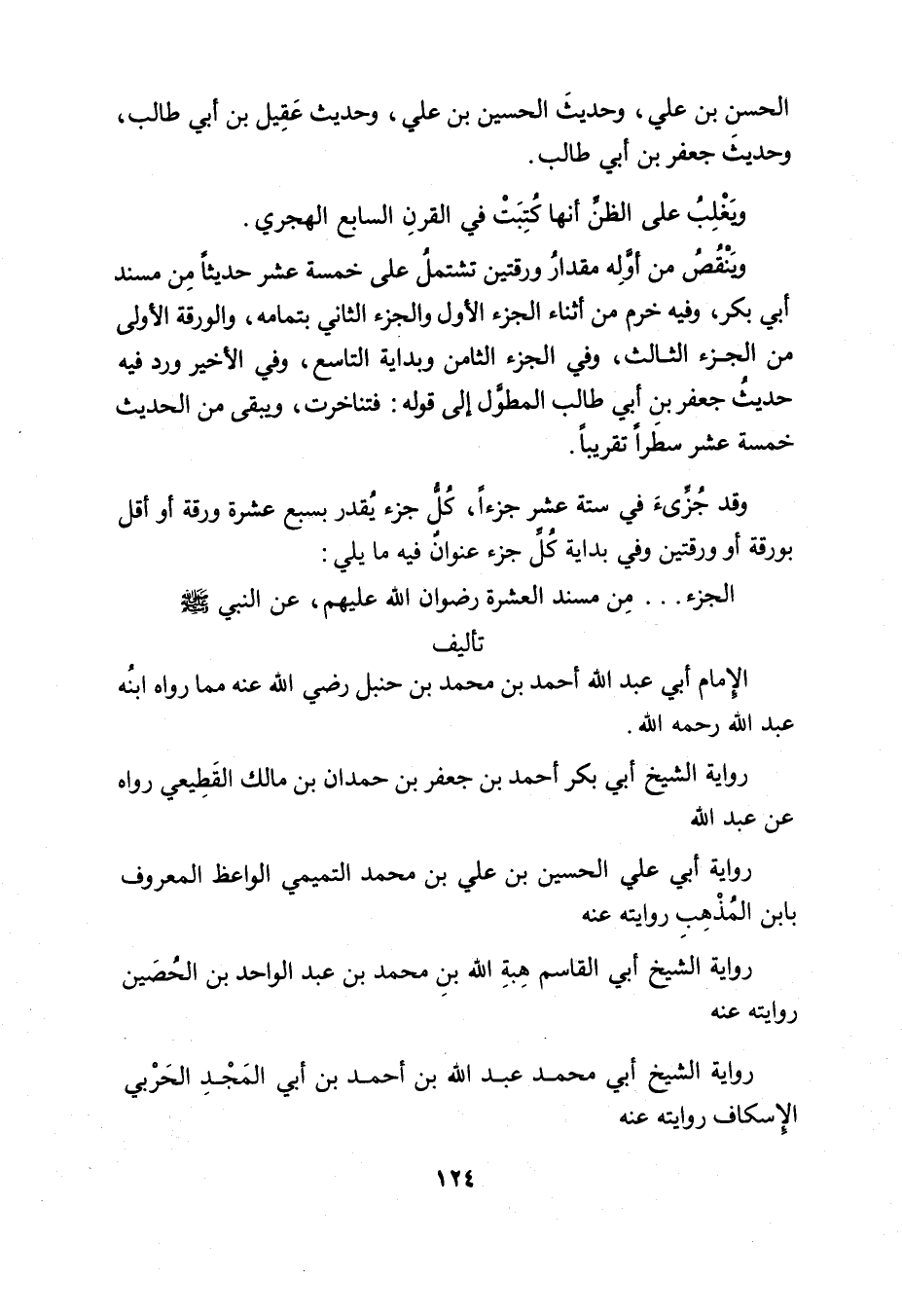 الحسن بن علي، وحديثَ الحسين بن علي، وحديث عَقيل بن أبي طالب، وحديثَ جعفر بن أبي طالب.