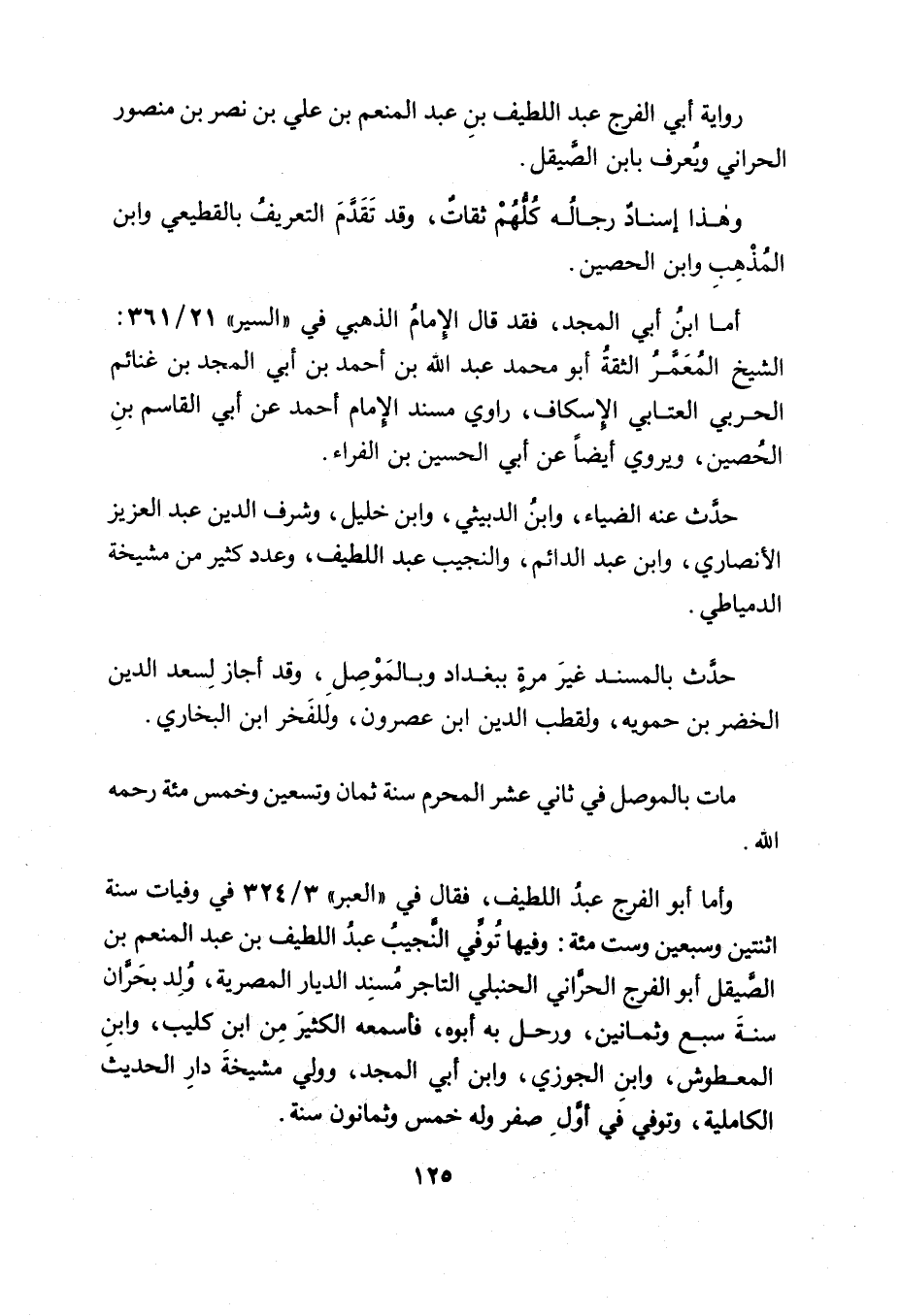وأما أبو الفرج عبدُ اللطيف، فقال في " العبر " ٣ / ٣٢٤ في وفيات سنة اثنتين وسبعين وست مئة: وفيها تُوفِّي النَّجيبُ عبدُ اللطيف بن عبد المنعم بن الصَّيقل أبو الفرج الحرَّاني الحنبلي التاجر مُسنِد الديار المصرية، وُلِد بحَرَّان سنةَ سبع وثمانين، ورحل به أبوه، فأسمعه الكثيرَ من ابن كليب، وابنِ
