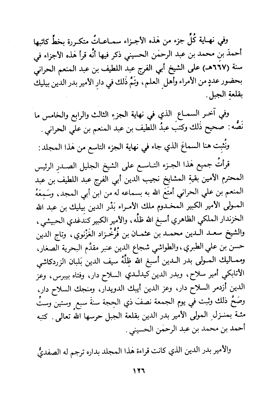 قرأتُ جميع هذا الجزء التاسع على الشيخ الجليل الصدرِ الرئيس المحترم الأمين بقيةِ المشايخ نجيب الدين أبي الفرج عبد اللطيف بن عبد المنعم بن علي الحراني أمتَعَ الله به بسماعه له من ابن أبي المجد، وسَمِعَهُ المولى الأمير الكبير المخدوم ملك الأمراء بَدْر الدين بِيليك بن عبد الله الخزندار الملكي الظاهري أسبغ الله ظلَّه، والأمير الكبير كندغدي الحبيشي، والشيخ سعد الدين محمد بن عثمان بن فُرُّخْزاد الغَزْنوي، وتاج الدين حسن بن علي الطبري، والطواشي شجاع الدين عنبر مقدَّم البحرية الصغار، ومماليك المولى بدر الدين أسبغ الله ظِلَّهُ سيف الدين بَلبان الزردكاشي الأتابكي أمير سلاح، وبدر الدين كيدلدي السلاح دار، وفتاه بيبرس، وعز الدين أزدمر السلاح دار، وعز الدين أيبك الدويدار، ومنجك السلاح دار، وصَحَّ ذلك وثبت في يوم الجمعة نصفَ ذي الحِجة سنةَ سبعٍ وستين وستِّ مئة بمنزلِ المولى الأمير بدر الدين بقلعة الجبل حرسها الله تعالى. كتبه