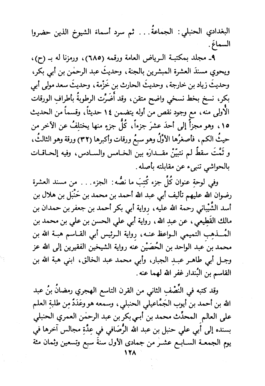 ٩- مجلد بمكتبة الرياض العامة ورقمه (٦٨٥) ، ورمزنا له بـ (ح) ، ويحوي مسندَ العشرة المبشرين بالجنة، وحديثَ عبد الرحمن بن أبي بكر، وحديثَ زياد بن خارجة، وحديثَ الحارث بن خَزْمة، وحديثَ سعد مولى أبي بكر، نسخ بخط نسخي واضح متقن، وقد أَضَرَّت الرطوبةُ بأطرافِ الورقات الأُولى منه، مع وجود نقص من أوله يتضمن ١٤ حديثاً، وقسماً من الحديث