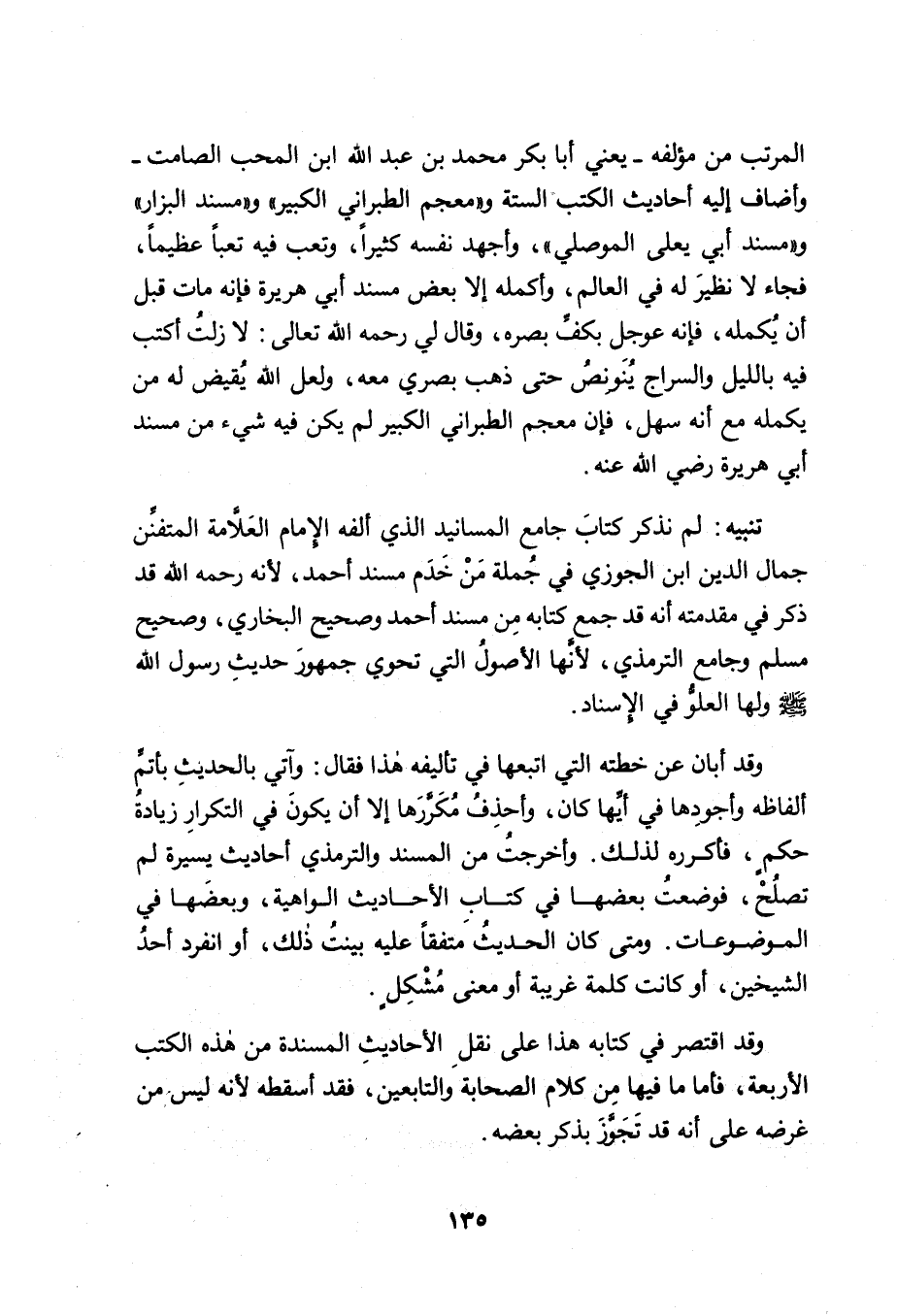المرتب من مؤلفه - يعني أبا بكر محمد بن عبد الله ابن المحب الصامت - وأضاف إليه أحاديث الكتب الستة و " معجم الطبراني الكبير " و " مسند البزار " و " مسند أبي يعلى الموصلي "، وأجهد نفسه كثيراً، وتعب فيه تعباً عظيماً، فجاء لا نظيرَ له في العالم، وأكمله إلا بعض مسند أبي هريرة فإنه مات قبل أن يُكمله، فإنه عوجِل بكفِّ بصره، وقال لي رحمه الله تعالى: لا زلتُ أكتب فيه بالليل والسراج يُنَونِصُ حتى ذهب بصري معه، ولعل الله يُقيض له من يكمله مع أنه سهل، فإن معجم الطبراني الكبير لم يكن فيه شيء من مسند أبي هريرة رضي الله عنه.