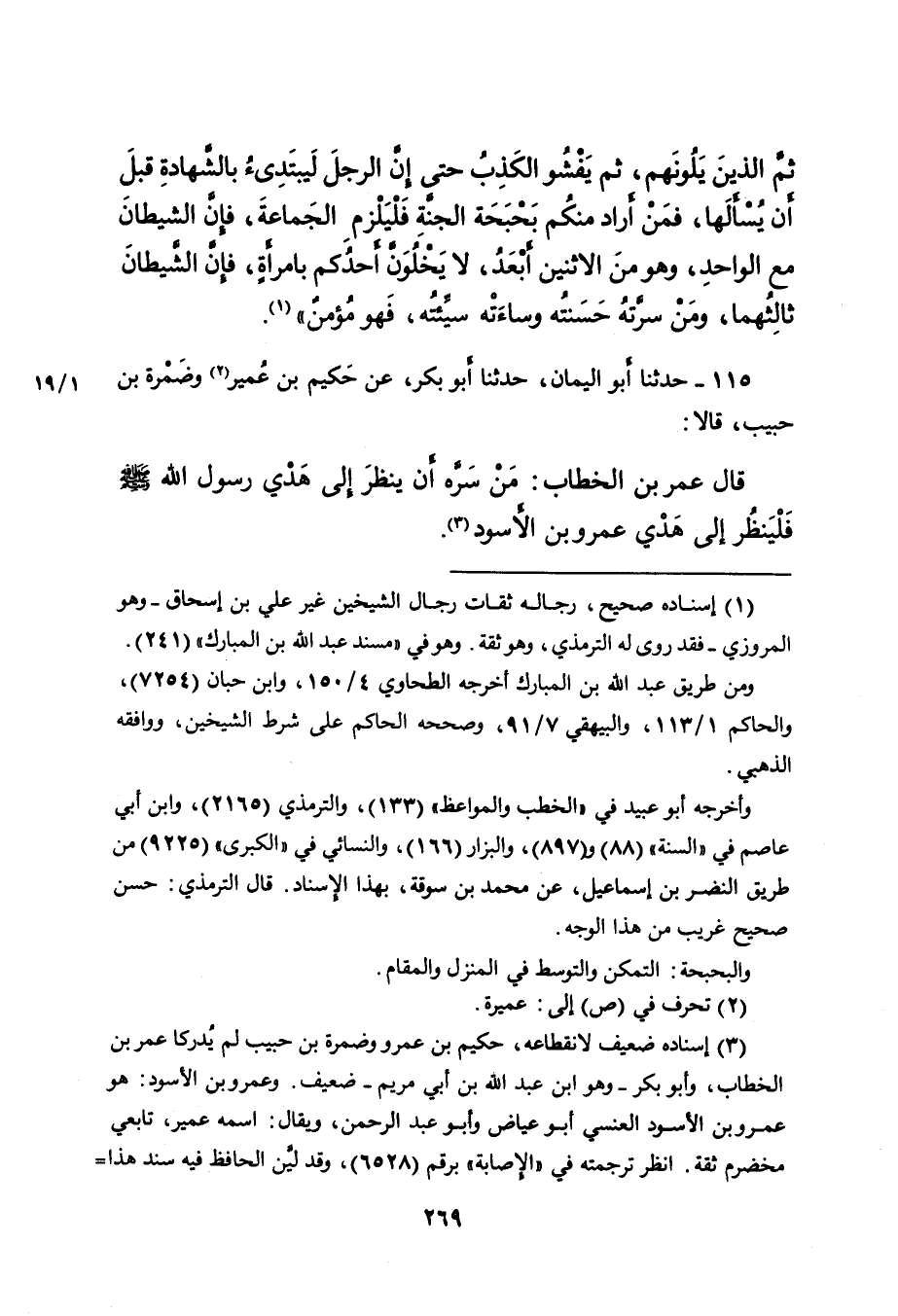 ثُمَّ الَّذِينَ يَلُونَهُمْ، ثُمَّ يَفْشُو الْكَذِبُ حَتَّى إِنَّ الرَّجُلَ لَيَبْتَدِئُ بِالشَّهَادَةِ قَبْلَ أَنْ يُسْأَلَهَا، فَمَنْ أَرَادَ مِنْكُمْ بَحْبَحَةَ الْجَنَّةِ فَلْيَلْزَمُ الْجَمَاعَةَ، فَإِنَّ الشَّيْطَانَ مَعَ الْوَاحِدِ، وَهُوَ مِنَ الِاثْنَيْنِ أَبْعَدُ، لَا يَخْلُوَنَّ أَحَدُكُمْ بِامْرَأَةٍ، فَإِنَّ الشَّيْطَانَ ثَالِثُهُمَا، وَمَنْ سَرَّتْهُ حَسَنَتُهُ وَسَاءَتْهُ سَيِّئَتُهُ، فَهُوَ مُؤْمِنٌ " (١) .