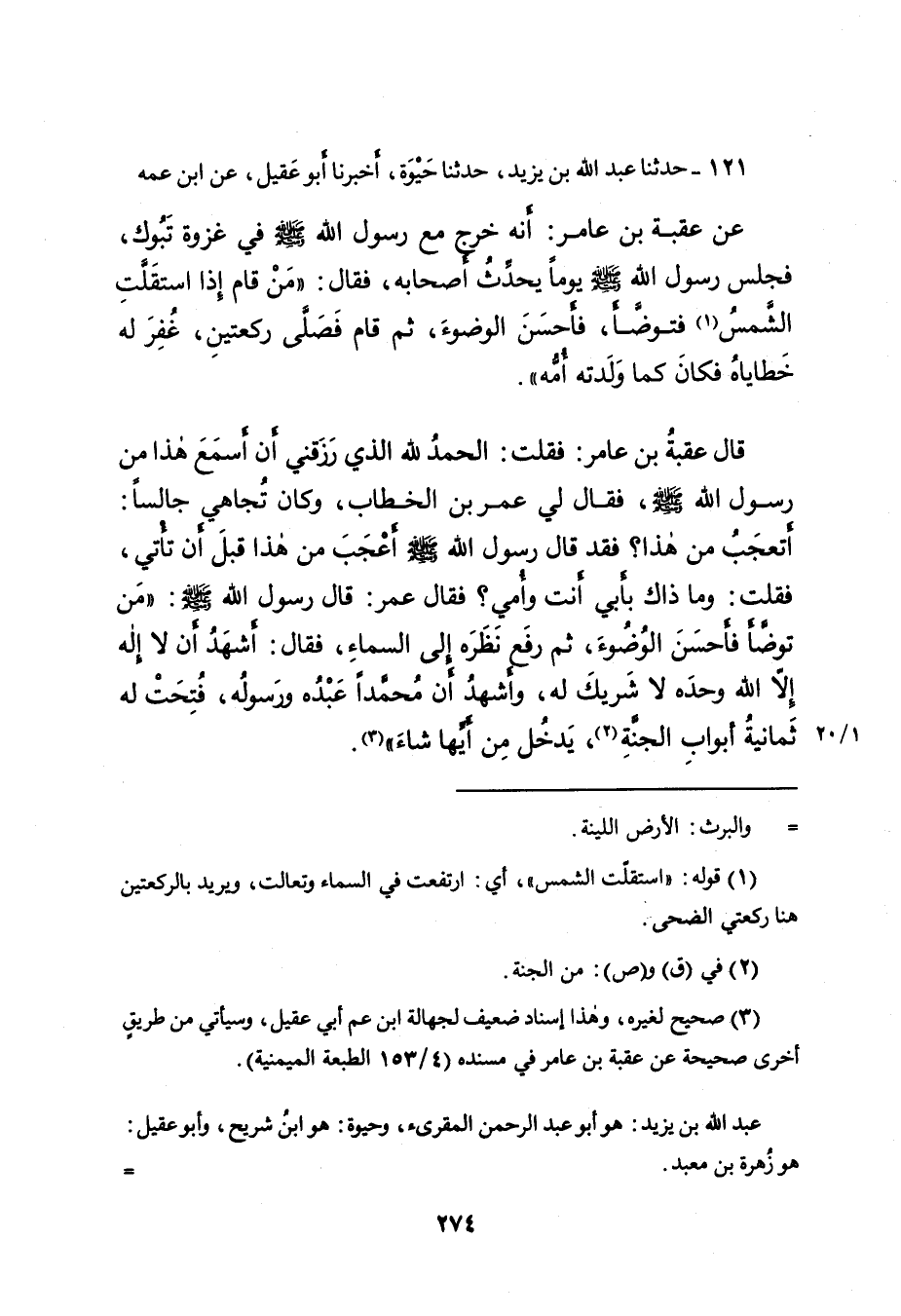عَنْ عُقْبَةَ بْنِ عَامِرٍ، أَنَّهُ خَرَجَ مَعَ رَسُولِ اللهِ صَلَّى اللهُ عَلَيْهِ وَسَلَّمَ فِي غَزْوَةِ تَبُوكَ، فَجَلَسَ رَسُولُ اللهِ صَلَّى اللهُ عَلَيْهِ وَسَلَّمَ يَوْمًا يُحَدِّثُ أَصْحَابَهُ، فَقَالَ: " مَنْ قَامَ إِذَا اسْتَقَلَّتِ الشَّمْسُ (١) فَتَوَضَّأَ، فَأَحْسَنَ الْوُضُوءَ، ثُمَّ قَامَ فَصَلَّى رَكْعَتَيْنِ، غُفِرَ لَهُ خَطَايَاهُ فَكَانَ كَمَا وَلَدَتْهُ أُمُّهُ ".