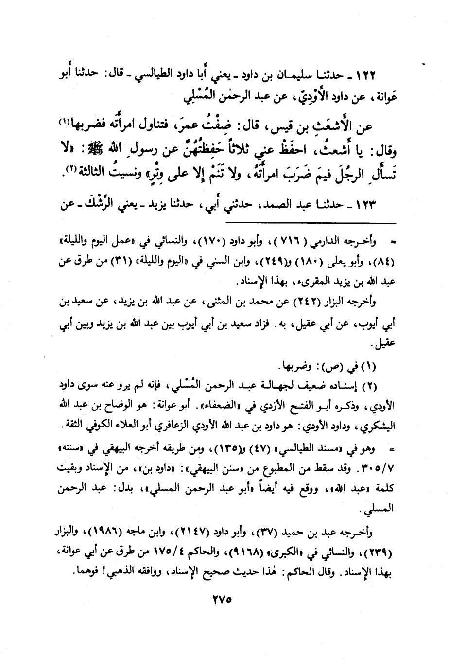 ١٢٢ - حَدَّثَنَا سُلَيْمَانُ بْنُ دَاوُدَ - يَعْنِي أَبَا دَاوُدَ الطَّيَالِسِيَّ - قَالَ: حَدَّثَنَا أَبُو عَوَانَةَ، عَنْ دَاوُدَ الْأَوْدِيِّ، عَنْ عَبْدِ الرَّحْمَنِ الْمُسْلِيِّ
