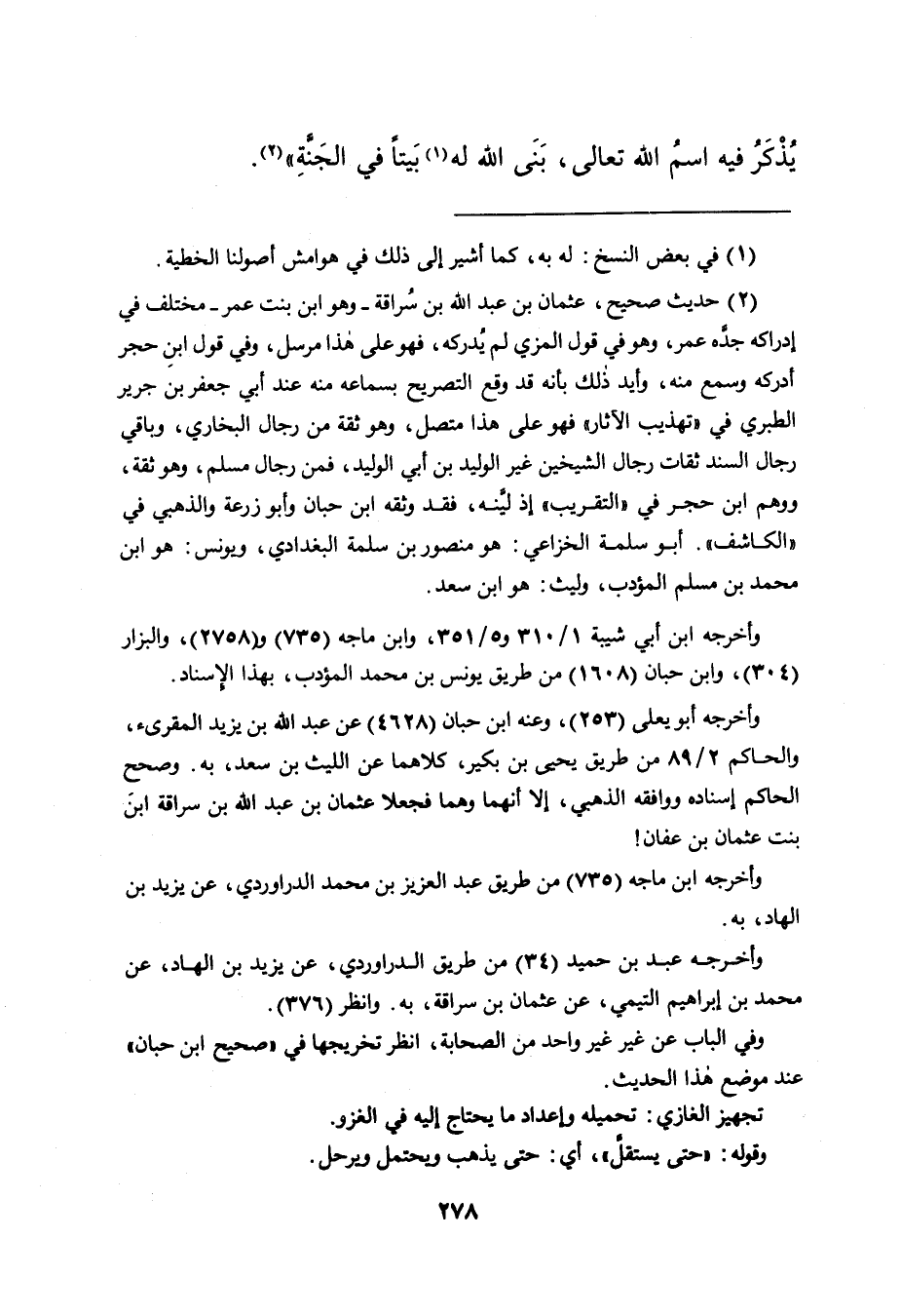 (٢) حديث صحيح، عثمان بن عبد الله بن سُراقة - وهو ابن بنت عمر - مختلف في إدراكه جدِّه عمر، وهو في قول المزي لم يُدركه، فهو على هذا مرسل، وفي قول ابنِ حجر أدركه وسمع منه، وأيد ذلك بأنه قد وقع التصريح بسماعه منه عند أبي جعفر بن جرير الطبري في " تهذيب الآثار " فهو على هذا متصل، وهو ثقة من رجال البخاري، وباقي رجال السند ثقات رجال الشيخين غير الوليد بن أبي الوليد، فمن رجال مسلم، وهو ثقة، ووهم ابن حجر في " التقريب " إذ ليَّنه، فقد وثقه ابن حبان وأبو زرعة والذهبي في " الكاشف ". أبو سلمة الخزاعي: هو منصور بن سلمة البغدادي، ويونس: هو ابن محمد بن مسلم المؤدب، وليث: هو ابن سعد.