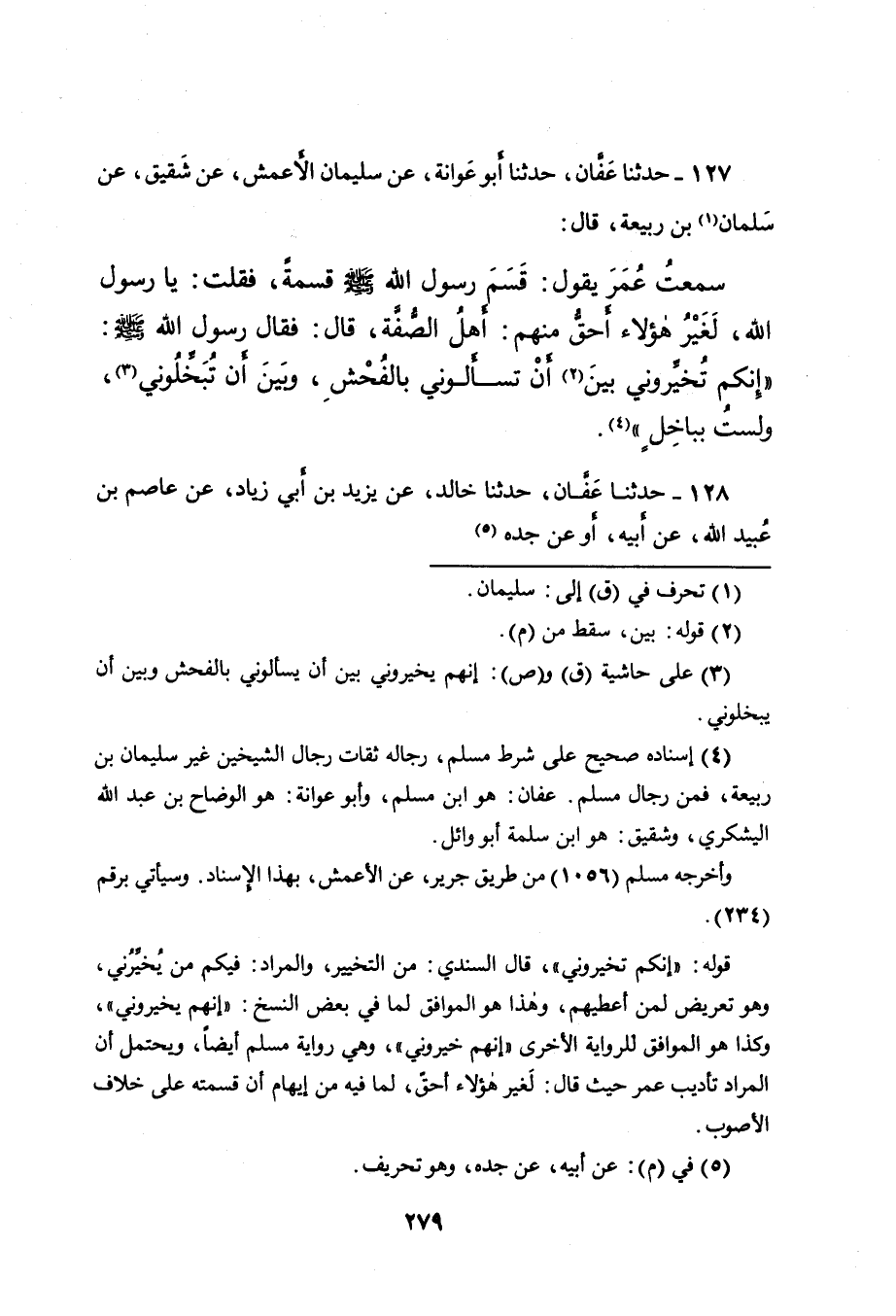 سَمِعْتُ عُمَرَ، يَقُولُ: قَسَمَ رَسُولُ اللهِ صَلَّى اللهُ عَلَيْهِ وَسَلَّمَ قِسْمَةً، فَقُلْتُ: يَا رَسُولَ اللهِ، لَغَيْرُ هَؤُلاءِ أَحَقُّ مِنْهُمْ: أَهْلُ الصُّفَّةِ، قَالَ: فَقَالَ رَسُولُ اللهِ صَلَّى اللهُ عَلَيْهِ وَسَلَّمَ: " إِنَّكُمْ تُخَيِّرُونِي بَيْنَ (٢) أَنْ تَسْأَلُونِي بِالْفُحْشِ، وَبَيْنَ أَنْ تُبَخِّلُونِي (٣) ، وَلَسْتُ بِبَاخِلٍ " (٤) .