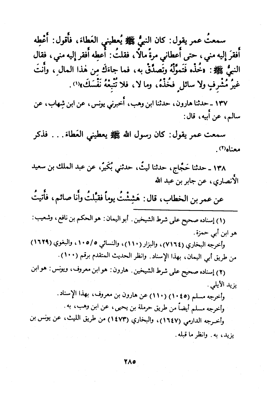 سَمِعْتُ عُمَرَ يَقُولُ: كَانَ رَسُولُ اللهِ صَلَّى اللهُ عَلَيْهِ وَسَلَّمَ يُعْطِينِي الْعَطَاءَ ... فَذَكَرَ مَعْنَاهُ (٢) .