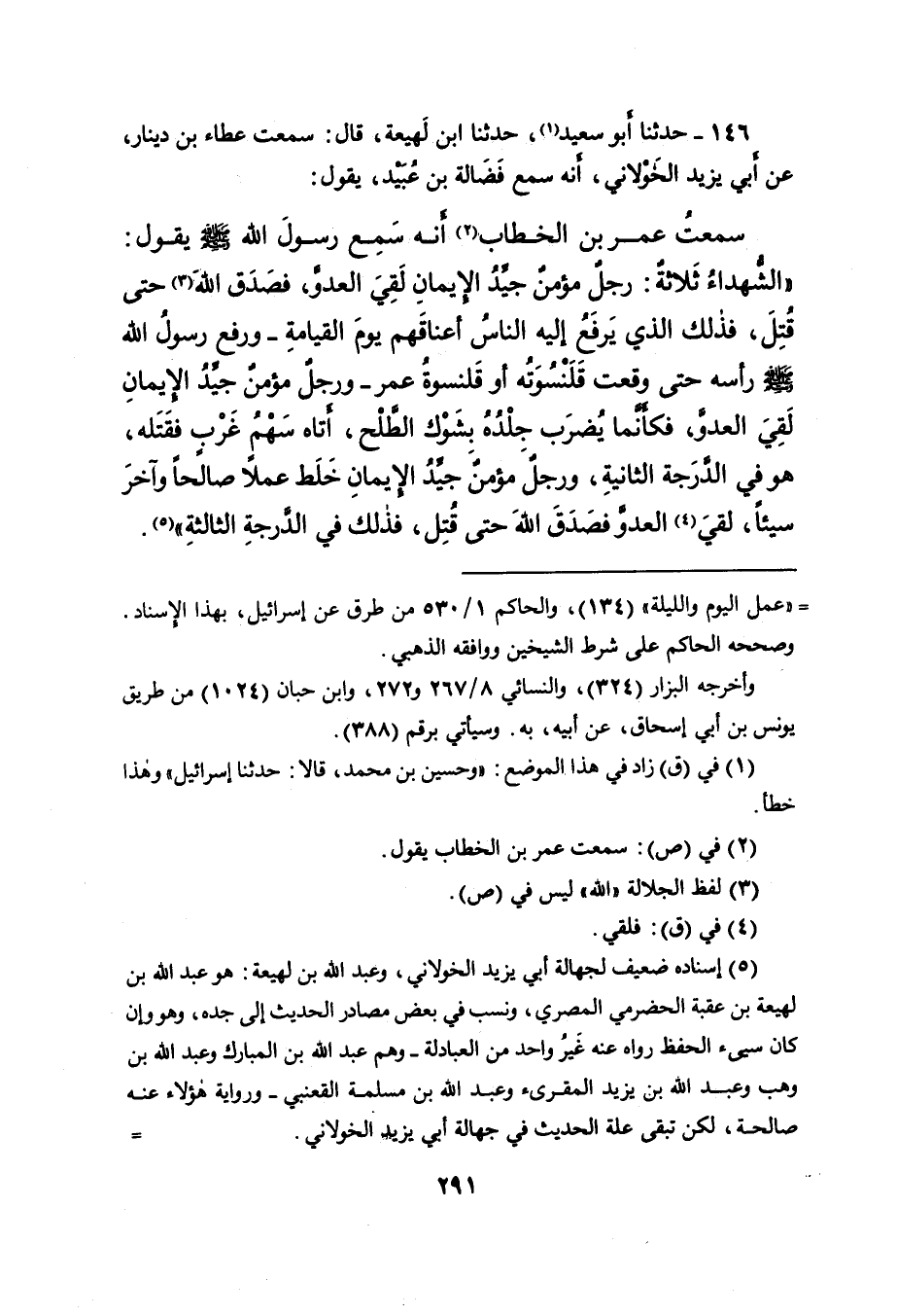 سَمِعْتُ عُمَرَ بْنَ الْخَطَّابِ (٢) أَنَّهُ سَمِعَ رَسُولَ اللهِ صَلَّى اللهُ عَلَيْهِ وَسَلَّمَ يَقُولُ: " الشُّهَدَاءُ ثَلاثَةٌ: رَجُلٌ مُؤْمِنٌ جَيِّدُ الْإِيمَانِ لَقِيَ الْعَدُوَّ، فَصَدَقَ اللهَ (٣) حَتَّى قُتِلَ، فَذَلِكَ الَّذِي يَرْفَعُ إِلَيْهِ النَّاسُ أَعْنَاقَهُمْ يَوْمَ الْقِيَامَةِ - وَرَفَعَ رَسُولُ اللهِ صَلَّى اللهُ عَلَيْهِ وَسَلَّمَ رَأْسَهُ حَتَّى وَقَعَتْ قَلَنْسُوَتُهُ أَوْ قَلَنْسُوَةُ عُمَرَ - وَرَجُلٌ مُؤْمِنٌ جَيِّدُ الْإِيمَانِ لَقِيَ الْعَدُوَّ، فَكَأَنَّمَا يُضْرَبُ جِلْدُهُ بِشَوْكِ الطَّلْحِ، أَتَاهُ سَهْمٌ غَرْبٌ فَقَتَلَهُ، هُوَ فِي الدَّرَجَةِ الثَّانِيَةِ، وَرَجُلٌ مُؤْمِنٌ جَيِّدُ الْإِيمَانِ خَلَطَ عَمَلًا صَالِحًا وَآخَرَ سَيِّئًا، لَقِيَ (٤) الْعَدُوَّ فَصَدَقَ اللهَ حَتَّى قُتِلَ، فَذَلِكَ فِي الدَّرَجَةِ الثَّالِثَةِ " (٥) .