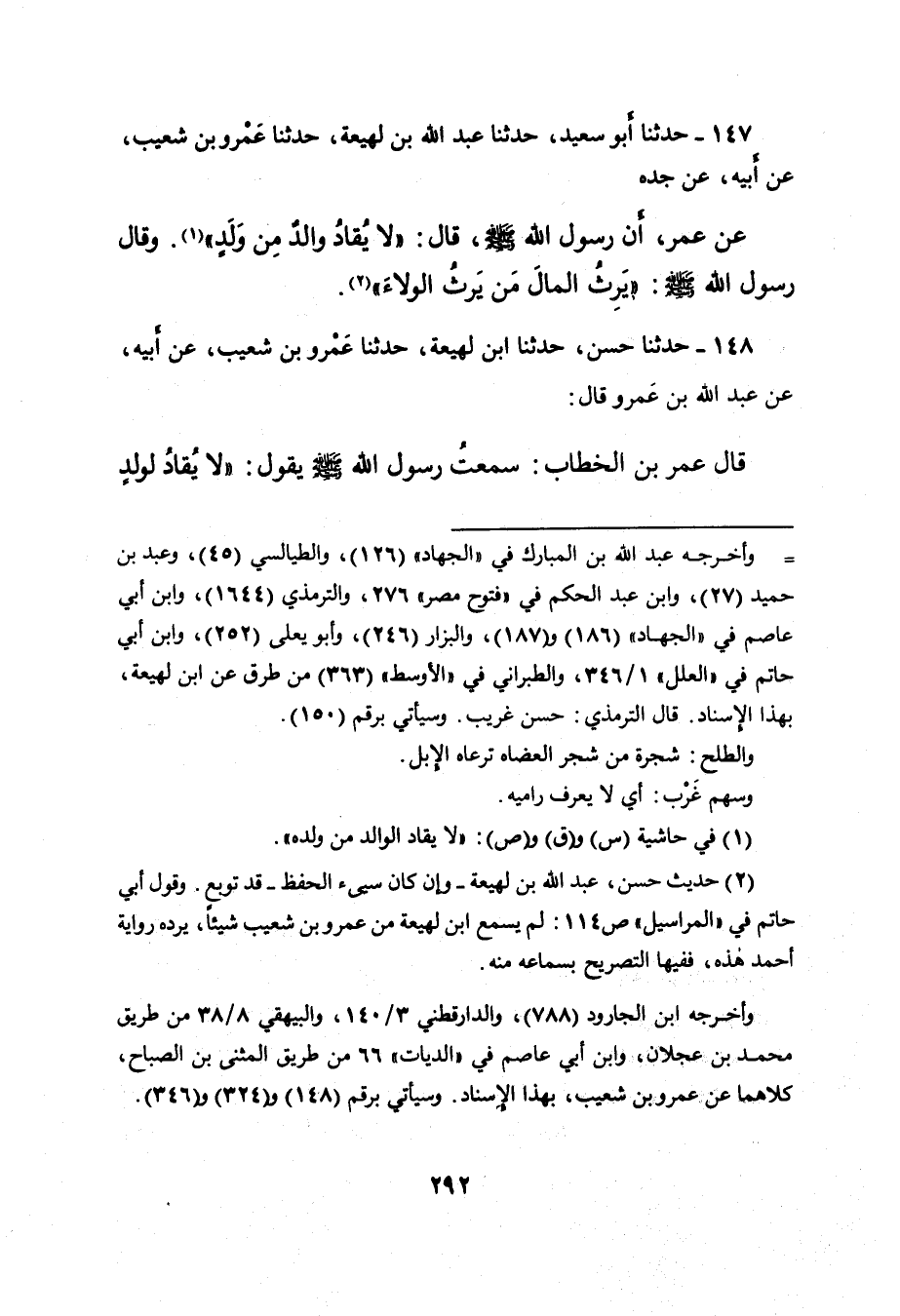 عَنْ عُمَرَ، أَنَّ رَسُولَ اللهِ صَلَّى اللهُ عَلَيْهِ وَسَلَّمَ، قَالَ: " لَا يُقَادُ وَالِدٌ مِنْ وَلَدٍ " (١) . وَقَالَ رَسُولُ اللهِ صَلَّى اللهُ عَلَيْهِ وَسَلَّمَ: " يَرِثُ الْمَالَ مَنْ يَرِثُ الْوَلاءَ " (٢) .