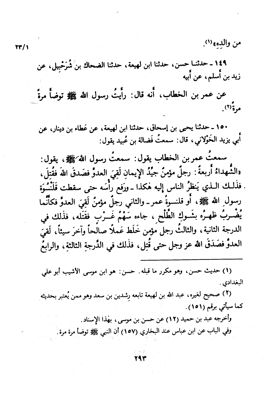 سَمِعْتُ عُمَرَ بْنَ الْخَطَّابِ يَقُولُ: سَمِعْتُ رَسُولَ اللهِ صَلَّى اللهُ عَلَيْهِ وَسَلَّمَ يَقُولُ: " الشُّهَدَاءُ أَرْبَعَةٌ: رَجُلٌ مُؤْمِنٌ جَيِّدُ الْإِيمَانِ لَقِيَ الْعَدُوَّ فَصَدَقَ اللهَ فَقُتِلَ، فَذَلِكَ الَّذِي يَنْظُرُ النَّاسُ إِلَيْهِ هَكَذَا - وَرَفَعَ رَأْسَهُ حَتَّى سَقَطَتْ قَلَنْسُوَةُ رَسُولِ اللهِ صَلَّى اللهُ عَلَيْهِ وَسَلَّمَ، أَوْ قَلَنْسُوَةُ عُمَرَ - وَالثَّانِي: رَجُلٌ مُؤْمِنٌ لَقِيَ الْعَدُوَّ فَكَأَنَّمَا يُضْرَبُ ظَهْرُهُ بِشَوْكِ الطَّلْحِ، جَاءَهُ سَهْمُ غَرْبٍ فَقَتَلَهُ، فَذَلكَ فِي الدَّرَجَةِ الثَّانِيَةِ، وَالثَّالِثُ: رَجُلٌ مُؤْمِنٌ خَلَطَ عَمَلًا صَالِحًا وَآخَرَ سَيِّئًا، لَقِيَ الْعَدُوَّ فَصَدَقَ اللهَ عَزَّ وَجَلَّ حَتَّى قُتِلَ، فَذَلكَ فِي الدَّرَجَةِ الثَّالِثَةِ، وَالرَّابِعُ