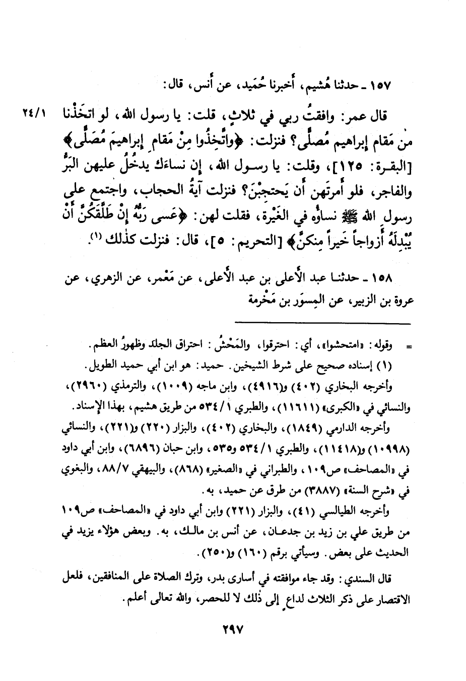 قَالَ عُمَرُ: وَافَقْتُ رَبِّي فِي ثَلاثٍ، قُلْتُ: يَا رَسُولَ اللهِ، لَوِ اتَّخَذْنَا مِنْ مَقَامِ إِبْرَاهِيمَ مُصَلًّى؟ فَنَزَلَتْ: {وَاتَّخِذُوا مِنْ مَّقَامِ إِبْرَاهِيمَ مُصَلًّى} [البقرة: ١٢٥] ، وَقُلْتُ: يَا رَسُولَ اللهِ، إِنَّ نِسَاءَكَ يَدْخُلُ عَلَيْهِنَّ الْبَرُّ وَالْفَاجِرُ، فَلَوْ أَمَرْتَهُنَّ أَنْ يَحْتَجِبْنَ؟ فَنَزَلَتْ آيَةُ الْحِجَابِ، وَاجْتَمَعَ عَلَى رَسُولِ اللهِ صَلَّى اللهُ عَلَيْهِ وَسَلَّمَ نِسَاؤُهُ فِي الْغَيْرَةِ، فَقُلْتُ لَهُنَّ: {عَسَى رَبُّهُ إِنْ طَلَّقَكُنَّ أَنْ يُبْدِلَهُ أَزْوَاجًا خَيْرًا مِّنْكُنَّ} [التحريم: ٥] ، قَالَ: فَنَزَلَتْ كَذَلِكَ (١) .