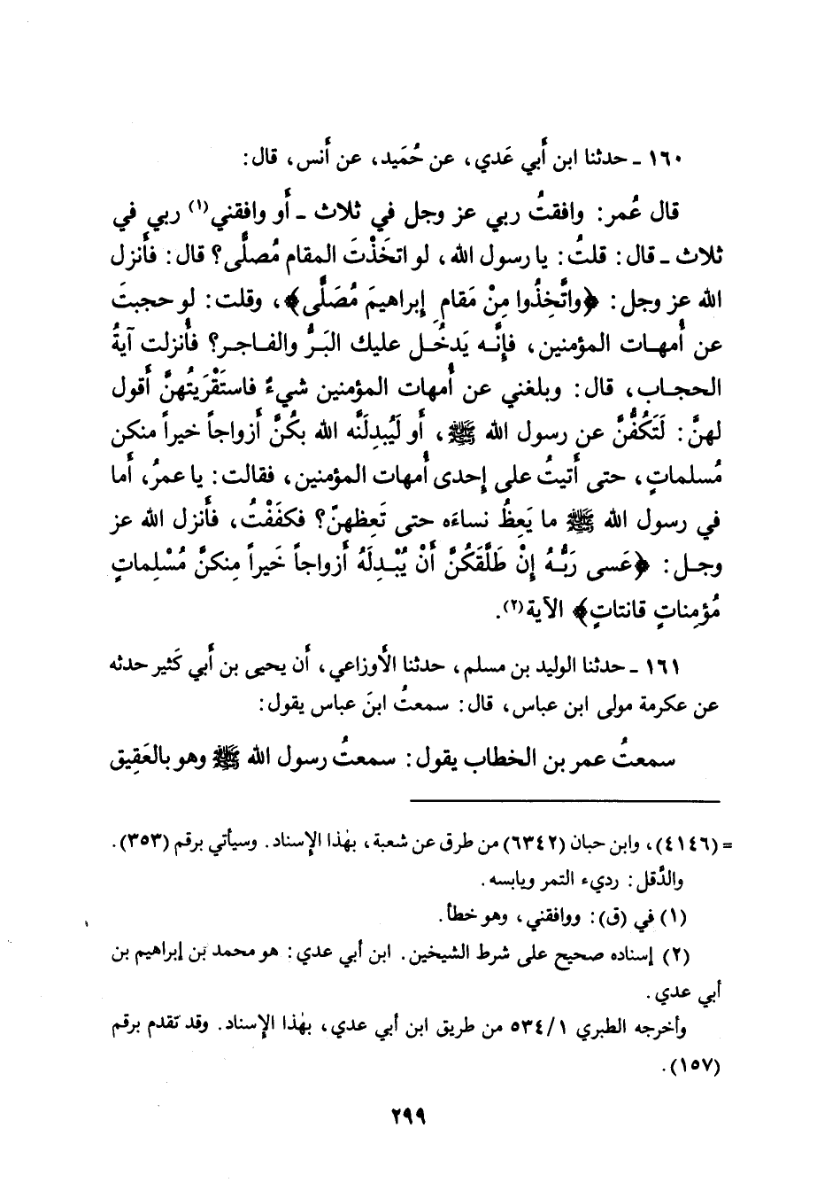 قَالَ عُمَرُ: وَافَقْتُ رَبِّي عَزَّ وَجَلَّ فِي ثَلاثٍ - أَوْ وَافَقَنِي (١) رَبِّي فِي ثَلاثٍ - قَالَ: قُلْتُ: يَا رَسُولَ اللهِ، لَوِ اتَّخَذْتَ الْمَقَامَ مُصَلًّى؟ قَالَ: فَأَنْزَلَ اللهُ عَزَّ وَجَلَّ: {وَاتَّخِذُوا مِنْ مَّقَامِ إِبْرَاهِيمَ مُصَلًّى} ، وَقُلْتُ: لَوْ حَجَبْتَ عَنْ أُمَّهَاتِ الْمُؤْمِنِينَ، فَإِنَّهُ يَدْخُلُ عَلَيْكَ الْبَرُّ وَالْفَاجِرُ؟ فَأُنْزِلَتْ آيَةُ الْحِجَابِ، قَالَ: وَبَلَغَنِي عَنْ أُمَّهَاتِ الْمُؤْمِنِينَ شَيْءٌ فَاسْتَقْرَيْتُهُنَّ أَقُولُ لَهُنَّ: لَتَكُفُّنَّ عَنْ رَسُولِ اللهِ صَلَّى اللهُ عَلَيْهِ وَسَلَّمَ، أَوْ لَيُبْدِلَنَّهُ اللهُ بِكُنَّ أَزْوَاجًا خَيْرًا مِنْكُنَّ مُسْلِمَاتٍ، حَتَّى أَتَيْتُ عَلَى إِحْدَى أُمَّهَاتِ الْمُؤْمِنِينَ، فَقَالَتْ: يَا عُمَرُ، أَمَا فِي رَسُولِ اللهِ صَلَّى اللهُ عَلَيْهِ وَسَلَّمَ مَا يَعِظُ نِسَاءَهُ حَتَّى تَعِظَهُنَّ؟ فَكَفَفْتُ، فَأَنْزَلَ اللهُ عَزَّ وَجَلَّ: {عَسَى رَبُّهُ إِنْ طَلَّقَكُنَّ أَنْ يُبْدِلَهُ أَزْوَاجًا خَيْرًا مِّنْكُنَّ مُسْلِمَاتٍ مُّؤْمِنَاتٍ قَانِتَاتٍ} الْآيَةَ (٢) .