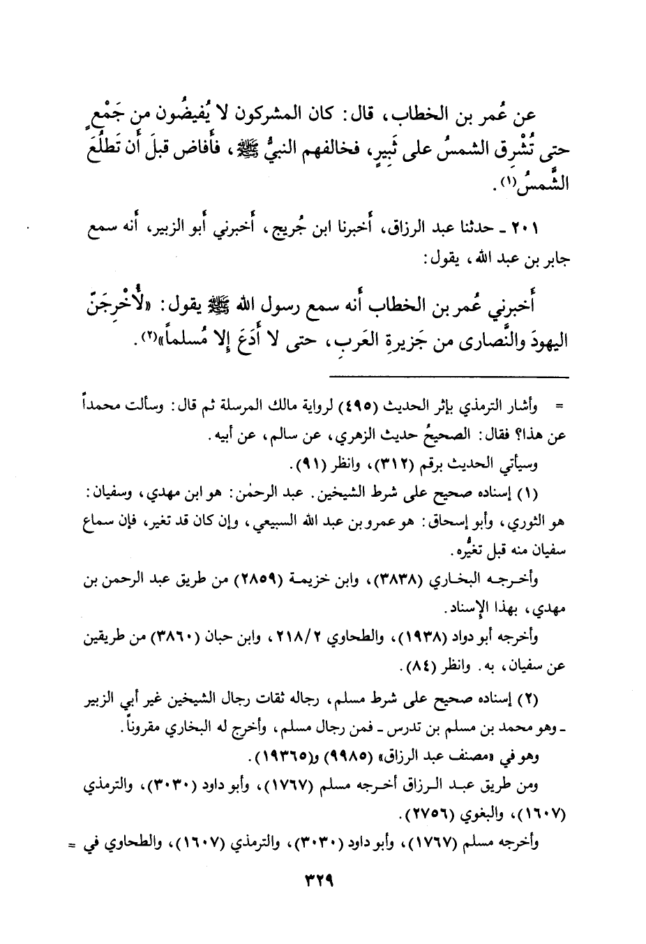 أَخْبَرَنِي عُمَرُ بْنُ الْخَطَّابِ، أَنَّهُ سَمِعَ رَسُولَ اللهِ صَلَّى اللهُ عَلَيْهِ وَسَلَّمَ يَقُولُ: " لَأُخْرِجَنَّ الْيَهُودَ وَالنَّصَارَى مِنْ جَزِيرَةِ الْعَرَبِ، حَتَّى لَا أَدَعَ إِلَّا مُسْلِمًا " (٢) .