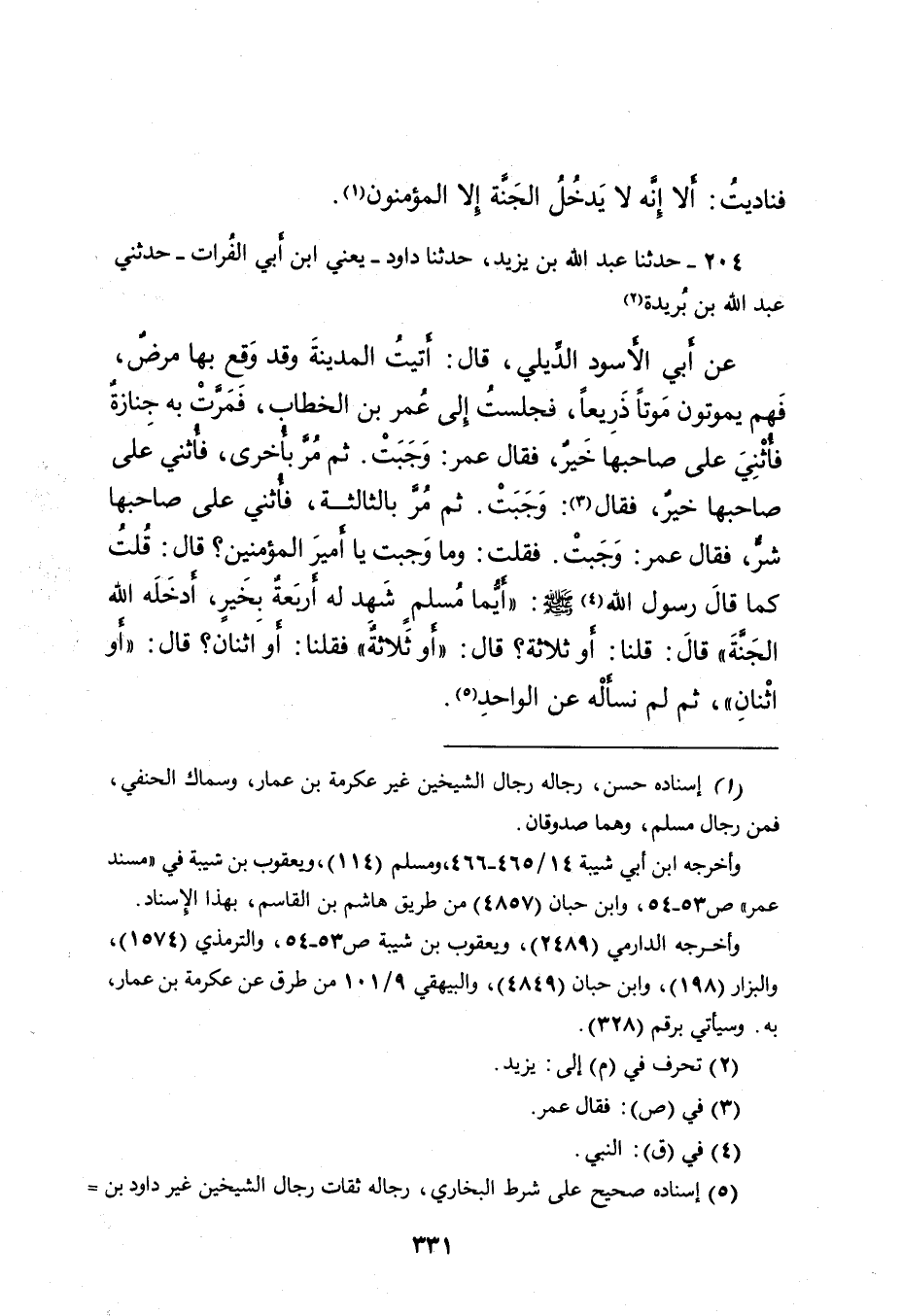عَنْ أَبِي الْأَسْوَدِ الدِّيلِيِّ، قَالَ: أَتَيْتُ الْمَدِينَةَ، وَقَدْ وَقَعَ بِهَا مَرَضٌ، فَهُمْ يَمُوتُونَ مَوْتًا ذَرِيعًا، فَجَلَسْتُ إِلَى عُمَرَ بْنِ الْخَطَّابِ، فَمَرَّتْ بِهِ جَنَازَةٌ فَأُثْنِيَ عَلَى صَاحِبِهَا خَيْرٌ، فَقَالَ عُمَرُ: وَجَبَتْ. ثُمَّ مُرَّ بِأُخْرَى، فَأُثْنِيَ عَلَى صَاحِبِهَا خَيْرٌ، فَقَالَ (٣) : وَجَبَتْ. ثُمَّ مُرَّ بِالثَّالِثَةِ، فَأُثْنِيَ عَلَى صَاحِبِهَا شَرٌّ، فَقَالَ عُمَرُ: وَجَبَتْ. فَقُلْتُ: وَمَا وَجَبَتْ يَا أَمِيرَ الْمُؤْمِنِينَ؟ قَالَ: قُلْتُ كَمَا قَالَ رَسُولُ اللهِ (٤) صَلَّى اللهُ عَلَيْهِ وَسَلَّمَ: " أَيُّمَا مُسْلِمٍ شَهِدَ لَهُ أَرْبَعَةٌ بِخَيْرٍ، أَدْخَلَهُ اللهُ الْجَنَّةَ " قَالَ: قُلْنَا: أَوْ ثَلاثَةٌ؟ قَالَ: " أَوْ ثَلاثَةٌ " فَقُلْنَا: أَوِ اثْنَانِ؟ قَالَ: " أَوِ اثْنَانِ "، ثُمَّ لَمْ نَسْأَلْهُ عَنِ الْوَاحِدِ (٥) .