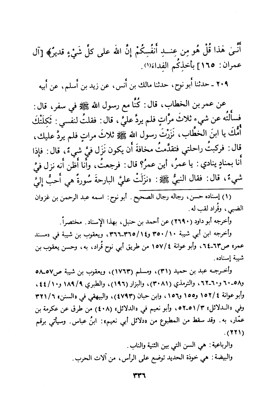 عَنْ عُمَرَ بْنِ الْخَطَّابِ، قَالَ: كُنَّا مَعَ رَسُولِ اللهِ صَلَّى اللهُ عَلَيْهِ وَسَلَّمَ فِي سَفَرٍ، قَالَ: فَسَأَلْتُهُ عَنْ شَيْءٍ ثَلاثَ مَرَّاتٍ فَلَمْ يَرُدَّ عَلَيَّ، قَالَ: فَقُلْتُ لِنَفْسِي: ثَكِلَتْكَ أُمُّكَ يَا ابْنَ الْخَطَّابِ، نَزَرْتَ رَسُولَ اللهِ صَلَّى اللهُ عَلَيْهِ وَسَلَّمَ ثَلاثَ مَرَّاتٍ فَلَمْ يَرُدَّ عَلَيْكَ، قَالَ: فَرَكِبْتُ رَاحِلَتِي فَتَقَدَّمْتُ مَخَافَةَ أَنْ يَكُونَ نَزَلَ فِيَّ شَيْءٌ، قَالَ: فَإِذَا أَنَا بِمُنَادٍ يُنَادِي: يَا عُمَرُ، أَيْنَ عُمَرُ؟ قَالَ: فَرَجَعْتُ، وَأَنَا أَظُنُّ أَنَّهُ نَزَلَ فِيَّ شَيْءٌ، قَالَ: فَقَالَ النَّبِيُّ صَلَّى اللهُ عَلَيْهِ وَسَلَّمَ: " نَزَلَتْ عَلَيَّ الْبَارِحَةَ سُورَةٌ هِيَ أَحَبُّ إِلَيَّ