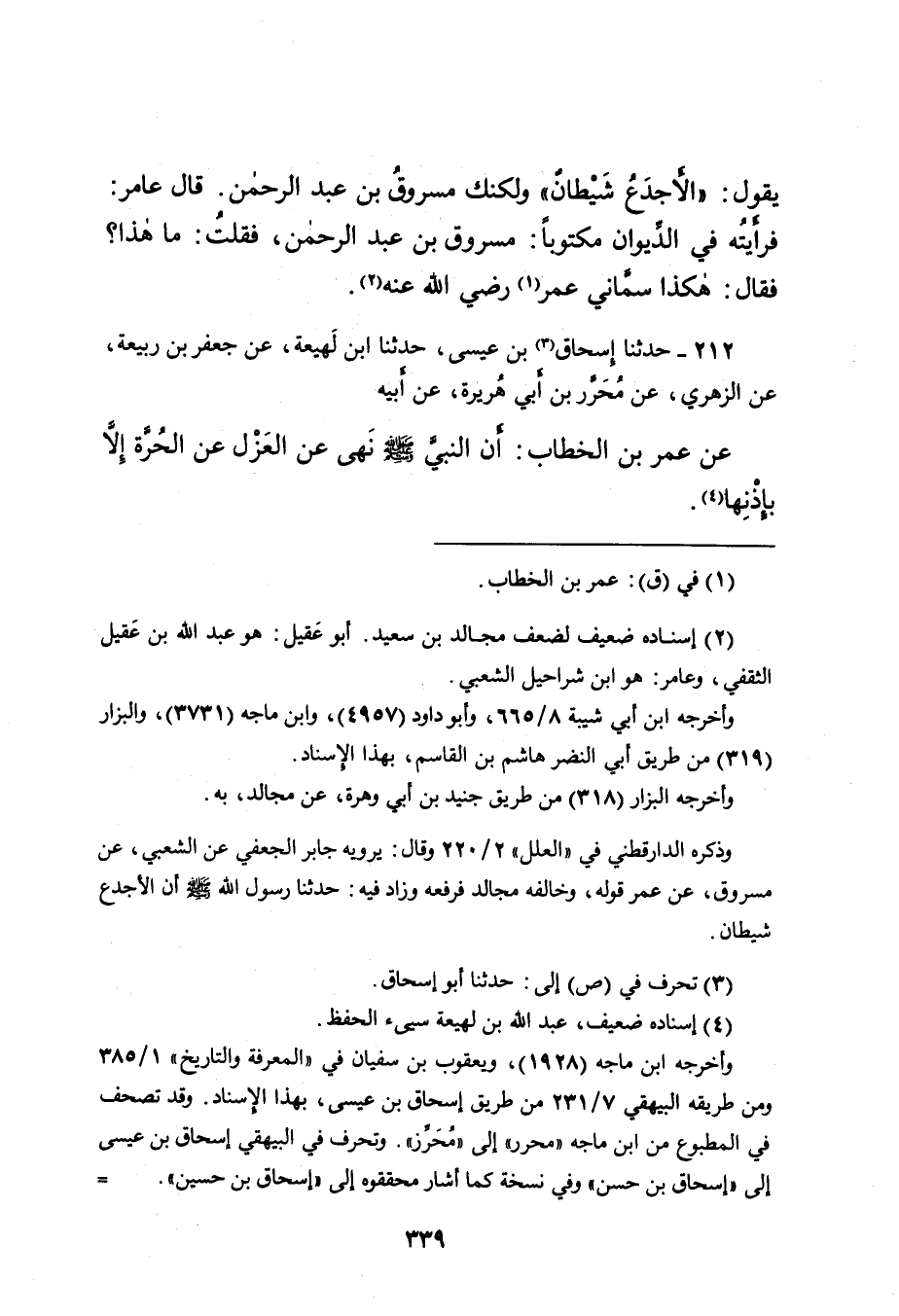 يَقُولُ: " الْأَجْدَعُ شَيْطَانٌ " وَلَكِنَّكَ مَسْرُوقُ بْنُ عَبْدِ الرَّحْمَنِ. قَالَ عَامِرٌ: فَرَأَيْتُهُ فِي الدِّيوَانِ مَكْتُوبًا: مَسْرُوقُ بْنُ عَبْدِ الرَّحْمَنِ، فَقُلْتُ: مَا هَذَا؟ فَقَالَ: هَكَذَا سَمَّانِي عُمَرُ (١) رَضِيَ اللهُ عَنْهُ (٢) .